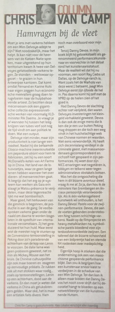 Moet je iets met varkens hebben om een Wim Delvoye-adept te zijn? Niet noodzakelijk, maar het helpt. Ik kan niet voor de heersers van de Katoen Natie spreken, maar uitgerekend op hun territorium kwam ik twee van Delvoyes getatoeëerde varkens tegen. Ze stonden - weliswaar opgezet - te grazen in hun Antwerpse kantoren. Dat komt omdat Fernand en Karine Huts naar eigen zeggen hun economische meevallers graag doen terugvloeien naar de hulpbehoevende artiest. Zo bezitten deze mecenassen ook een gigantische collectie expressionistische werken van voormalig VLD-minister Rik Daems. Je vraagt je af wanneer hij tussen het leegknijpen van tubes verf ooit nog de tijd vindt om aan politiek te doen. Wat een output. Delvoye niet minder, maar zijn productiviteit is niet langer een raadsel. Nadat hij die befaamde Cloaca-machine ineenknutselde om peperdure stront voor hem te fabriceren, zet hij nu een soort McDonald's-keten van Art Farms op in China. Het land van de lotusvoetjes, waar ze geen lange tenen hebben wanneer het over dieren- of mensenrechten gaat. Ik begrijp dat het erg op je systeem kan werken als Gaia erin slaagt je Watou-présence te verijdelen, maar deze tegenreactie lijkt me wat bombastisch. Maar goed, het herkauwen van die gimmick is begonnen, de productie is aan de gang. De veelbesproken varkens gaan onder de naald om daarna te worden losgelaten in de speeltuin van internationale verzamelaars. Zij het gereduceerd tot hun huid. Maar eerst wist de meester nog te stunten op de Conversions-tentoonstelling in Peking door zo'n paraderende achterham van de kop van Lenin te voorzien. De dalai lama was geen probleem geweest, net zo min als Mickey Mouse aan het kruis. De Chinese cultuurpolitie zijn ook maar boeren en reageren op eenvoudige prikkels. Ze rukken ook uit met stokken waar nodig... zoals op tentoonstellingen. Lenin op een achterham, dood aan de varkens. En dan moet je weten dat varkens in China als geluksbrengers gelden. Maar oké, het is maar een artistiek faits divers. Ham noch man overboord voor mijn part. Tenzij Danny Devos. In mijn boek blijft hij geboekstaafd als gerenommeerd performancekunstenaar en voorvechter in het debat rond het kunstenaarsstatuut. Maar de realiteit wil dat hij nu voorman, een soort Ray Crebs uit Dallas, op de Delvoye-ranch is. Want zoals het de Warhols van deze wereld betaamt, jaagt Wim Delvoye eerst zijn ijlbode de hel in. Pas daarna komt hij zelf met de VPRO op de hielen zien of het goed is. Had Danny Devos de slachting echter niet verijdeld, dan waren Delvoyes investeringen tot kleingeld verhakkeld geweest. Devos is dan ook de enige mens die ik ken die je een uur buiten Peking mag droppen en die toch een weg vindt in het huichelachtige web van Chinese normen en waarden. Niet eens verwonderlijk. Hij heeft zich decennialang verdiept in de criminele geest, met massamoordenaars gecorrespondeerd en zichzelf niet gespaard in zijn performances. Hij weet door zijn NICC-ervaringen wat negotiëren is, lobbyen en telkens weer tegen administratieve obstakels botsen. Was het die ontgoocheling die hem in dit bizarre avontuur dreef, vraag ik me af. Zo ja, dan hou ik de ministers Van Grembergen en Anciaux persoonlijk verantwoordelijk. Als ik één varkensgelieerd kunstwerk wil onthouden, is het Danny Devos' Parels voor de zwijnen-performance. Devos, die aan de voeten gebonden ondersteboven hing tussen schichtige varkens. Naakt op de filmprojectie en heavy-metalklanken na, symbolische parels bloedend voor zijn terdoodveroordeelde zwijnen. Een tafereel dat de bizarre schoonheid van een bidprentje had en stemde tot nadenken over medeplichtigheid.. Eigenlijk hoop ik stiekem dat die onderneming ook een van masochisme gespeende performance blijkt. Dan zou ik begrijpen hoe een kunstenaar ervoor kiest te verdwijnen in de schaduw van een Wim Delvoye. Tot dan kan ik alleen maar bidden dat Danny Devos het nooit zover drijft dat hij decoratief hangt te bloeden op een netwerkfeestje van die kunstminnende Hutsen.