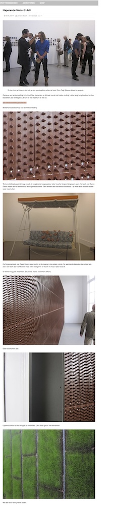 En dan kom je thuis en dan heb je één openingsfoto achter de hand. Zoro Feigl (blauwe bloes) in gesprek. Opnieuw een tentoonstelling in Arti met fijne elementen en ditmaal vooral met krekke routing. Lekker stug terughoudend en des bezoekers pas vertragend. Je kunt er niet in/je kunt er niet uit. arti.nl/tentoonstelling.php?id=363 Beeldimpressie/doorloop van de tentoonstelling: Tentoonstellingsbepalend traag zwaait de bespijkerde toegangsdeur ieder kwartier tergend langzaam open. Het werk van Danny Devos maakt dat het element tijd wordt geintroduceerd. Eens temeer daar de tentoon doodloopt – je moet door dezelfde spleet weer naar buiten. De Zwammenbank van Zeger Reyers staat rechts bij de ingang in de andere ruimte. De wachtende bezoeker kan alvast iets zien. Een bank als wachtkamer maar zitten zwiegeren en kozen ho maar. kijken does it. Er komen nog gele zwammen. En zwarte. Verse zwammen althans. Geen doorkomen aan. Opentreuzelend tot een krappe 30 centimeter. Of in ieder geval: net mensbreed. Met aan de b-kant groene zoden. Daarachter een centrale zaal met oranje buizen van Zoro Feigl, polaroids van Paul Kooiker. Zoro Feigl’s Gently: meandert en beweegt traag door de ruimte. Tekeningen Raquel Maulwurf. Dan Walwin rekken in het donker. Francis Alys Tornadofilm vormt het eindpunt. Dick El Demasiado over de tentoon: