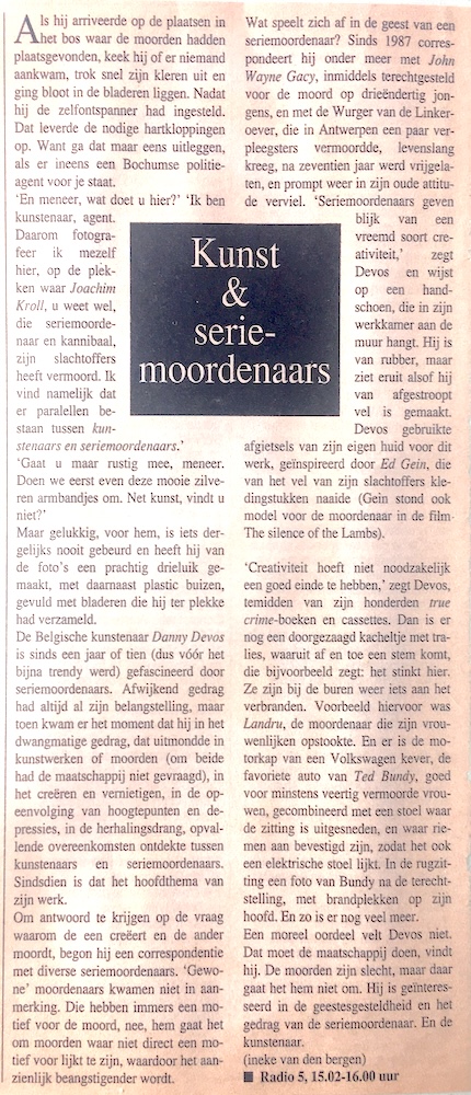 Als hij arriveerde op de plaatsen in het bos waar de moorden hadden plaatsgevonden, keek hij of er niemand aankwam, trok snel zijn kleren uit en ging bloot in de bladeren liggen. Nadat hij de zelfontspanner had ingesteld. Dat leverde de nodige hartkloppingen op. Want ga dat maar eens uitleggen, als er ineens een Bochumse politieagent voor je staat. 'En meneer, wat doet u hier?' 'Ik ben kunstenaar, agent. Daarom fotografeer ik mezelf hier, op de plekken waar Joachim Kroll, u weet wel, die seriemoordenaar en kannibaal, zijn slachtoffers heeft vermoord. Ik vind namelijk dat er paralellen bestaan tussen Kunstenaars en seriemoordenaars.' 'Gaat u maar rustig mee, meneer. Doen we eerst even deze mooie zilveren armbandjes om. Net kunst, vindt u niet?' Maar gelukkig, voor hem, is iets dergelijks nooit gebeurd en heeft hij van de foto's een prachtig drieluik gemaakt, met daarnaast plastic buizen, gevuld met bladeren die hij ter plekke had verzameld. De Belgische kunstenaar Danny Devos is sinds een jaar of tien (dus voór het bijna trendy werd) gefascineerd door seriemoordenaars. Afwijkend gedrag had altijd al zijn belangstelling, maar toen kwam er het moment dat hij in het dwangmatige gedrag, dat uitmondde in kunstwerken of moorden (om beide had de maatschappij niet gevraagd), in het creëren en vernietigen, in de opeenvolging van hoogtepunten en depressies, in de herhalingsdrang, opallende overeenkomsten ontdekte tussen kunstenaars en seriemoordenaars. Sindsdien is dat het hoofdthema van zijn werk. Om antwoord te kriigen op de vraag waarom de een creëert en de ander moordt, begon hij een correspondentie met diverse seriemoordenaars. 'Gewone' moordenaars kwamen niet in aanmerking. Die hebben immers een motief voor de moord, nee, hem gaat het om moorden waar niet direct een motief voor lijkt te zijn, waardoor het aanzienlijk beangstigender wordt. Wat speelt zich af in de geest van een seriemoordenaar? Sinds 1987 correspondeert hij onder meer met John Wayne Gacy, inmiddels terechtgesteld voor de moord op drieëndertig jongens, en met de Wurger van de Linkeroever, die in Antwerpen een paar verpleegsters vermoordde, levenslang kreeg, na zeventien jaar werd vrijgelaten, en prompt weer in zijn oude attitude verviel. 'Seriemoordenaars geven bliik een vreemd soort creativiteit, zegt Devos en wijst op een handschoen, die in ziin werkkamer aan de muur hangt. Hij is van rubber, maar ziet eruit alsof hij van afgestroopt vel is gemaakt. Devos gebruikte afgietsels van zijn eigen hand voor dit werk, geïnspireerd door Ed Gein, die van het vel van zijn slachtoffers kledingstukken naaide (Gein stond ook model voor de moordenaar in de film The silence of the Lambs). "Creativiteit hoeft niet noodzakelijk een goed einde te hebben,' zegt Devos, temidden van zijn honderden true crime-boeken en cassettes. Dan is er nog een doorgezaagd kacheltje met tralies, waaruit af en toe een stem komt, die bijvoorbeeld zegt: het stinkt hier. Ze zijn bij de buren weer iets aan het verbranden. Voorbeeld hiervoor was Landru, de moordenaar die zijn vrouwenlijken opstookte. En er is de motorkap van een Volkswagen kever, de favorite auto van Ted Bundy, goed voor minstens veertig vermoorde vrouwen, gecombineerd met een stoel waar de zitting is uitgesneden, en waar riemen aan bevestigd zijn, zodat het ook een elektrische stoel lijkt. In de rugzitting een foto van Bundy na de terechtstelling, met brandplekken op zijn hoofd. En zo is er nog veel meer. Een moreel oordeel velt Devos niet. Dat moet de maatschappij doen, vindt hij. De moorden zijn slecht, maar daar gaat het hem niet om. Hij is geinteresseerd in de geestesgesteldheid en het gedrag van de seriemoordenaar. En de kunstenaar. (ineke van den bergen) • Radio 5, 15.02-16.00 ur