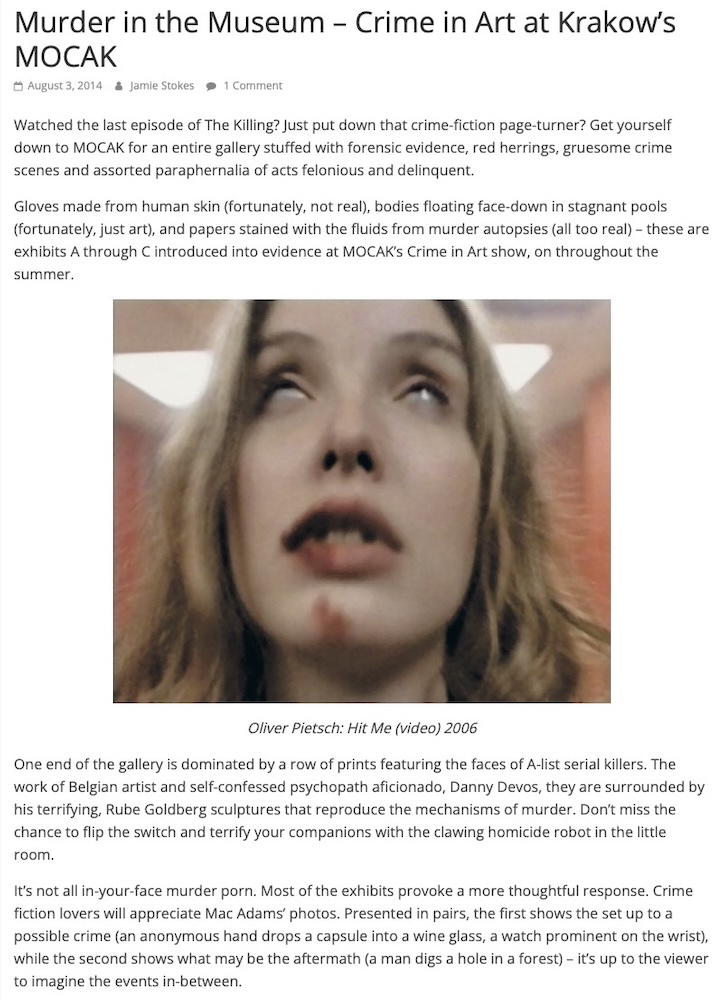 Crime in Art at Krakow’s MOCAK Jamie Stokes in The Krakow Post, Sunday 3rd August 2014, Poland. | |