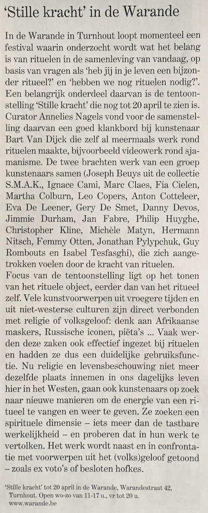 In de Warande in Turnhout loopt momenteel een festival waarin onderzocht wordt wat het belang is van rituelen in de samenleving van vandaag, op basis van vragen als 'heb jij in je leven een bijzonder ritueel?' en 'hebben we nog rituelen nodig?'. Een belangrijk onderdeel daarvan is de tentoonstelling 'Stille kracht' die nog tot 20 april te zien is. Curator Annelies Nagels vond voor de samenstelling daarvan een goed klankbord bij kunstenaar Bart Van Dijck die zelf al meermaals werk rond rituelen maakte, bijvoorbeeld videowerk rond sjamanisme. De twee brachten werk van een groep kunstenaars samen (Joseph Beuys uit de collectie S.M.A.K., Ignace Cami, Marc Claes, Fia Cielen, Martha Colburn, Leo Copers, Anton Cotteleer, Eva De Leener, Gery De Smet, Danny Devos, Jimmie Durham, Jan Fabre, Philip Huyghe, Christopher Kline, Michèle Matyn, Hermann Nitsch, Femmy Otten, Jonathan Pylypchuk, Guy Rombouts en Isabel Tesfasghi), die zich aangetrokken voelen door de kracht van rituelen.