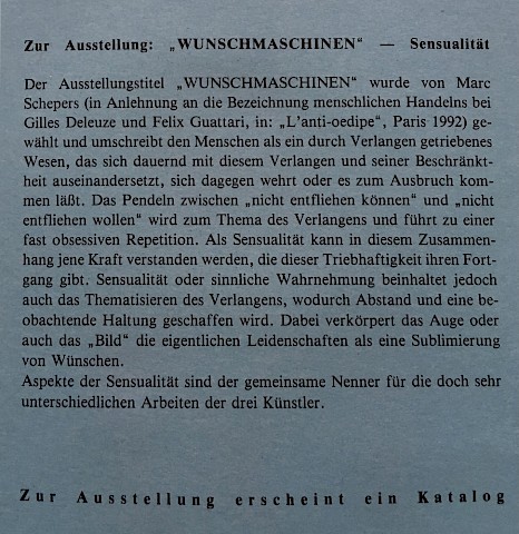 Der Ausstellungstitel „WUNSCHMASCHINEN" wurde von Marc Schepers (in Anlehnung an die Bezeichnung menschlichen Handelns bei Gilles Deleuze und Felix Guattari, in: „L'anti-oedipe", Paris 1992) gewählt und umschreibt den Menschen als ein durch Verlangen getriebenes Wesen, das sich dauernd mit diesem Verlangen und seiner Beschränktheit auseinandersetzt, sich dagegen wehrt oder es zum Ausbruch kommen läßt. Das Pendeln zwischen „nicht entfliehen können" und „nicht entfliehen wollen" wird zum Thema des Verlangens und führt zu einer fast obsessiven Repetition. Als Sensualität kann in diesem Zusammenhang jene Kraft verstanden werden, die dieser Triebhaftigkeit ihren Fortgang gibt. Sensualität oder sinnliche Wahrnehmung beinhaltet jedoch auch das Thematisieren des Verlangens, wodurch Abstand und eine beobachtende Haltung geschaffen wird. Dabei verkörpert das Auge oder auch das „Bild" die eigentlichen Leidenschaften als eine Sublimierung von Wünschen. Aspekte der Sensualität sind der gemeinsame Nenner für die doch sehr unterschiedlichen Arbeiten der drei Künstler. | ||