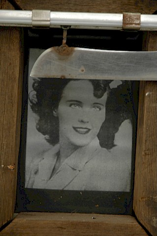 In de hoek van de ruimte vinden we ‘Erd Ecke’ van Danny Devos, zorgvuldig opgebouwd uit goudkleurig schelpenzand dat werd opgegraven uit de Antwerpse ondergrond tijdens ‘Digging for Gordon’: een nieuwe kier, een nieuwe opening, een nieuwe doorboring, voortdurend zichtbaar op een monitor achter het raam van het NICC. Dan nog een derde bijdrage van Danny Devos: het speciaal door mij gevraagde, uit 1989 daterende werk ‘Black Dahlia’, waarop twee verroeste messen eeuwig heen en weer zagen voor de zwaar omlijste gezichten van de dame in kwestie. Nog een driedelig werk met kieren.