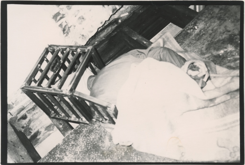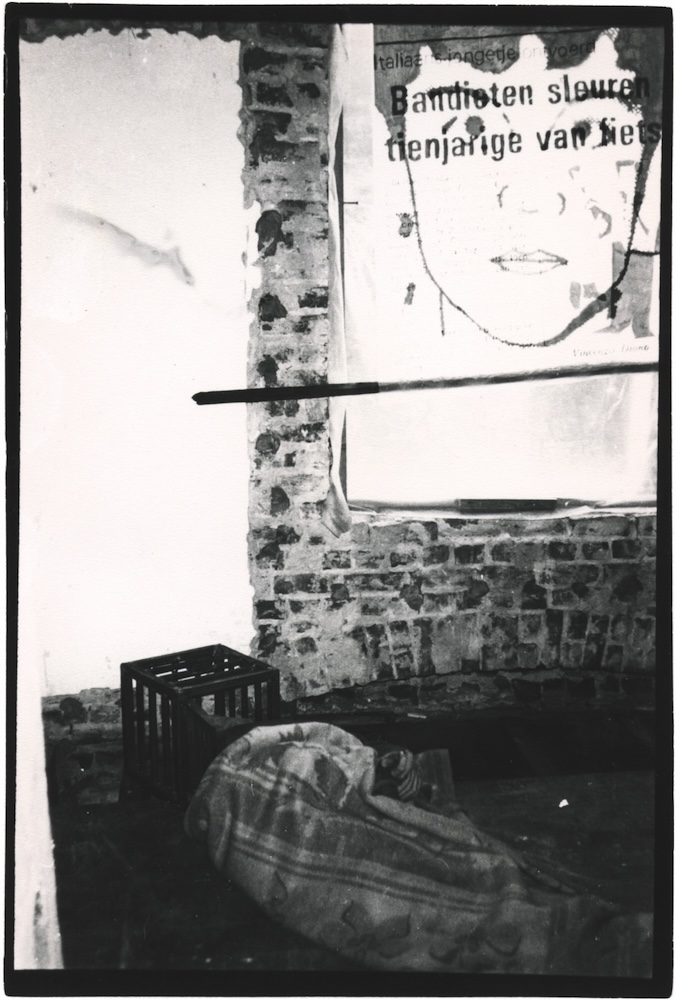 In een verlaten huis lag ik in een kamer half in een deken gewikkeld vastgebonden en met mijn hoofd in een metalen kooi. Aan de muur hing een werk van AMVK over een ontvoerd Italiaans jongetje. In an abandoned house I was laying in a room half covered by a blanket tied up and with my head in a metal cage. On the wall hung a work by AMVK about a kidnapped Italian boy. | ||