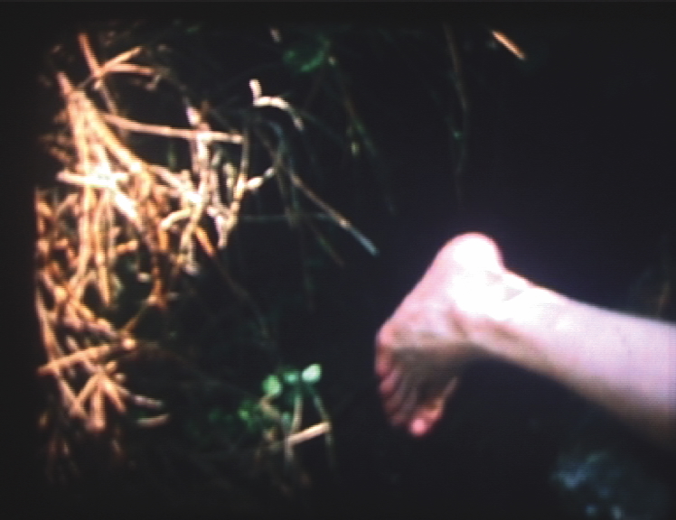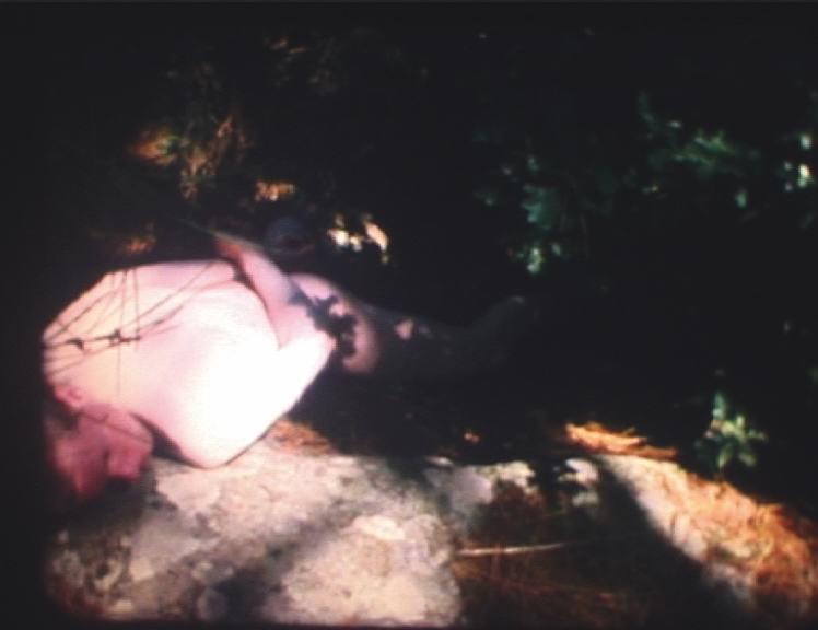 Bij een bezoek aan een Dolmen in Bretagne, Frankrijk, vroeg ik Danny om naakt op de grond te liggen, op zijn buik met een tak tussen zijn enkels gebonden en zijn handen op zijn rug gebonden. Het was een geheim eerbetoon aan de tijd waarin we elkaar leerden kennen, en hij een performance "I Wanna be Injured" deed aan het eind van mijn tentoonstelling "=Basic" in Art Something, Amsterdam. Ik filmde een drie minuten durend Super8 filmpje van zijn performance, zonder enige montage achteraf. Enkel de energie van de plek en de geheimzinnigheid van het gebeuren bepaalden mijn handelen. We besloten hetzelfde te doen op diverse rituele plaatsen die we in de toekomst zouden bezoeken. - AMVK, 1989 When visiting a Dolmen in Brittany, France, I asked Danny to lay down naked on his stomach with his legs open, a piece of wood tied between his ankles, his hands tied behind his back. A secret performance to pay an hommage to the time we met and when he did the performance "I Wanna be Injured" at the end of my exhibition "=Basic" in Art Something, Amsterdam. I shot a three minute Super8 movie of his performance, no editing afterwards. Only the energy of the spot and the secrecy of the event defined my actions. | ||