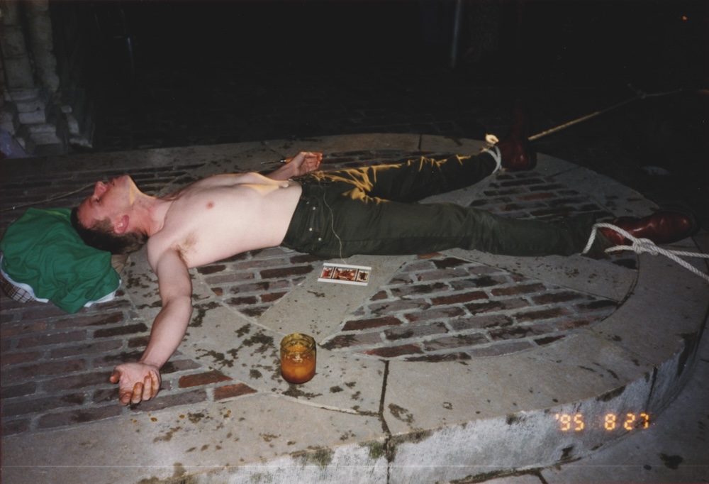Het publiek ging de ruimte binnen door een glazen deur. Daarna maakte ik een dun touw vast aan de buitenkant van de deur ging op de grond liggen en bond mijn voeten vast aan twee palen op het voetpad. Het andere eind van het touw slikte ik in. De performance stopte toen iemand de deur van binnenuit opende. The audience entered the space through a glass door. Then I tied a thin rope to the outside of the door lay down on the ground and tied my feet to two posts on the street. The other end of the rope I swallowed. The performance stopped when someone opened the door from the inside. | ||