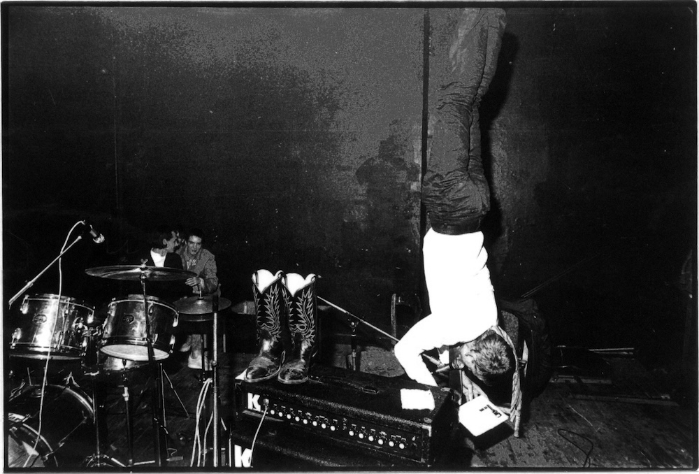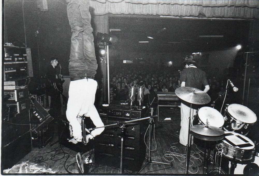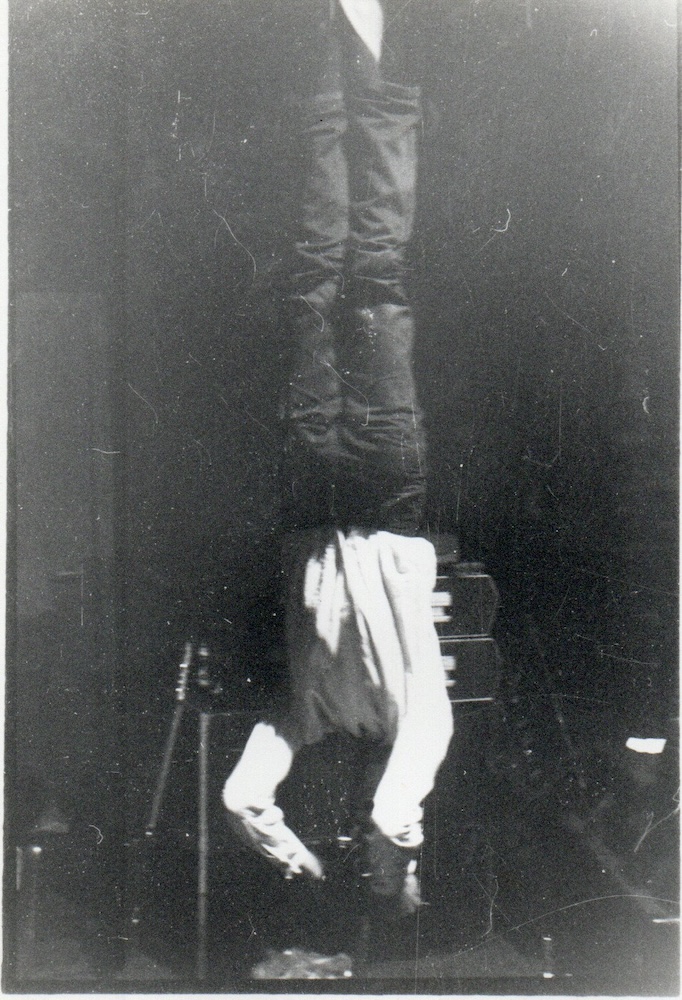 Tijdens een optreden van de groep ‘Perfectone’ las ik aan mijn voeten opgehangen een instructieve tekst voor over Braun flitsapparaten. Ondertussen werden vanop het podium door verschillende fotografen flitsopnames van het publiek gemaakt. During a concert by the band ‘Perfectone’ I was hanging upside-down and reading an instructive manual on Braun flash-devices. In the meanwhile several photographers made flashlight-pictures from the audience. | ||