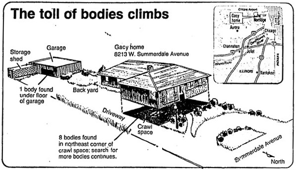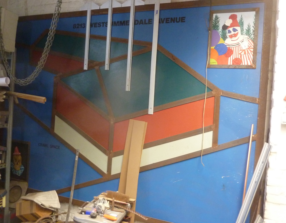 A large heavy metal frame depicts the house and its crawl space of serial killer John Wayne Gacy aka The Killer Clown. John Wayne Gacy (17 March 1942 – 10 May 1994) was an American serial killer and sex offender who raped, tortured and murdered at least thirty-three young men and boys between 1972 and 1978 in Norwood Park Township, a suburb of Chicago, Illinois. He became known as the 'Killer Clown' due to his public performances as a clown prior to the discovery of his crimes. From 28 August 1987 to 12 August 1990 I corresponded with him and bought two of his paintings, 'Pogo the Clown' and 'Skull Clown'. Gacy also sent me several hand painted greeting cards. He also reproduced my first letter in his book 'They Call Him Mr. Gacy', published in 1989 by McClelland Associates. Metal, plywood, paint, two original Gacy paintings, 203cm x 288cm x 6cm. Property of the artist. | ||