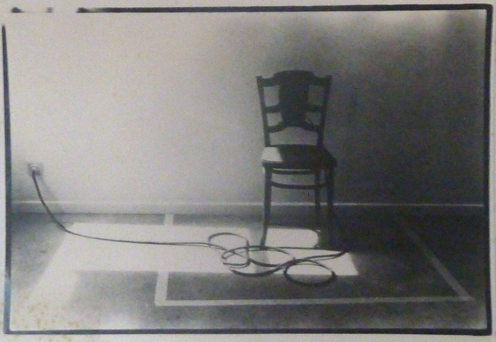 A household chair reworked into an electric chair. Made for an exhibition of weapons for a PrivéMilicia. Metal, wood, electric wire, 88cm x 40cm x 40cm. Collection of Didier Casimiro. | ||