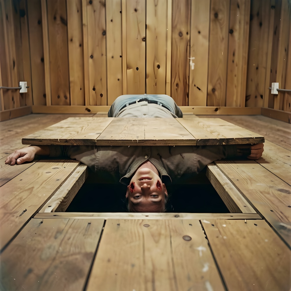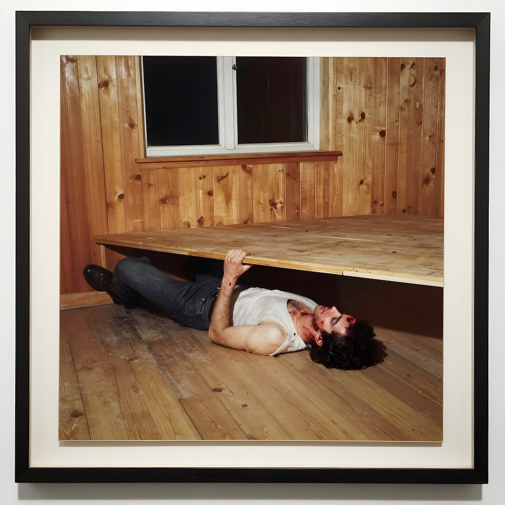 Performance art - 11 January 1979 - During a party I made an installation at the entrance with wooden walls and a wooden floor. I lay under the floor supporting the wood with my body. My head and chest were visible through a window in the floor. Before I had inflicted wounds on my head and chest. After 3 hours I stopped because some spectators were reacting too aggressive. An AI image for my 'Installation - 1' performance. The description above was the prompt for the generated image. An image generated by an AI Machine Learning Model Property of the artist. | ||