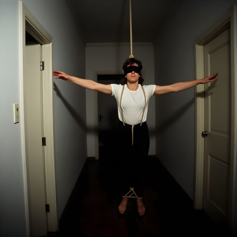 Performance art - 13 May 1979 - I was hanging with my arms spread and blindfolded in a darkened corridor. To my feet ropes were attached leading to the door. Each time somebody entered he/she pulled my body towards him/her. An AI image for my 'Installation - 2' performance. The description above was the prompt for the generated image. An image generated by an AI Machine Learning Model Property of the artist. | ||