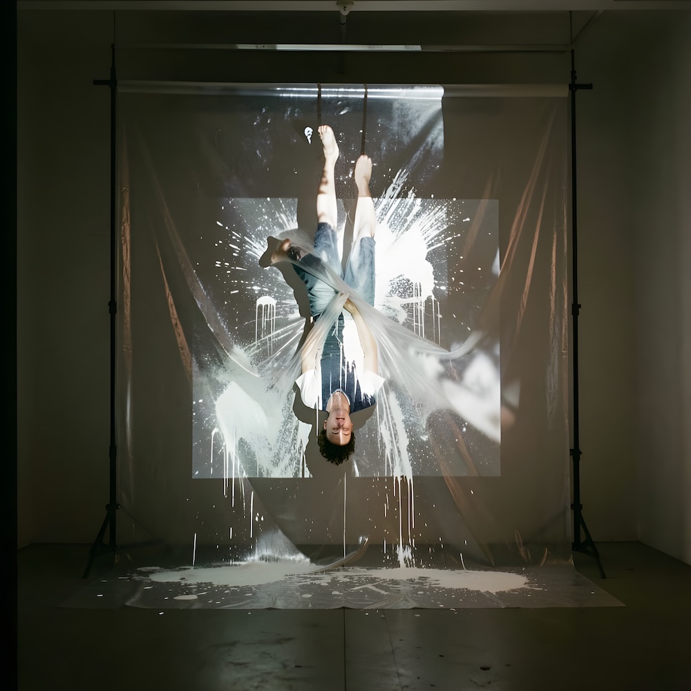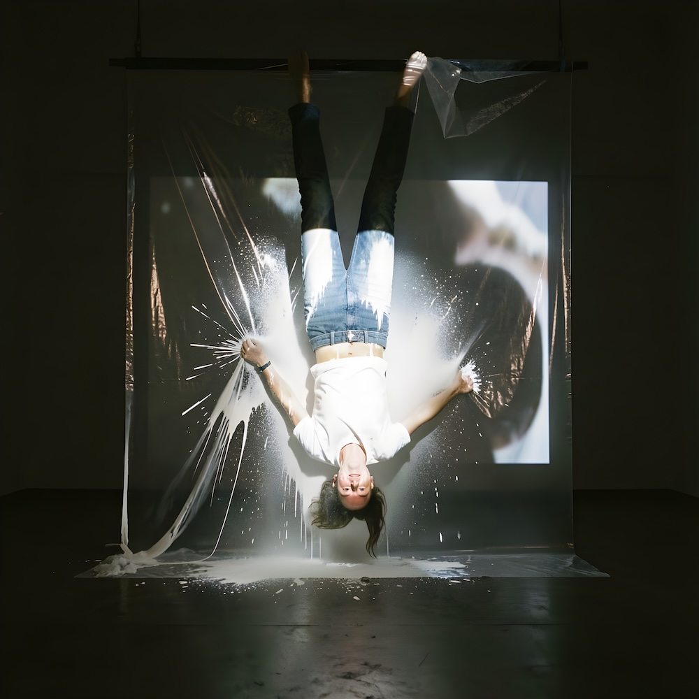 Performance art - 8 June 1979 - In a darkened room a slide was projected onto a sheet of transparent plastic. From behind I sprayed white paint on it so the projection became visible: a view of the backroom in which I hung upside down. Unseen by the audience I hung myself in the same way. While violently swinging my body back and forth I could reach the plastic and pull it away while all the lights were switched on. An AI image for my 'Untitled' performance. The description above was the prompt for the generated image. An image generated by an AI Machine Learning Model Property of the artist. | ||