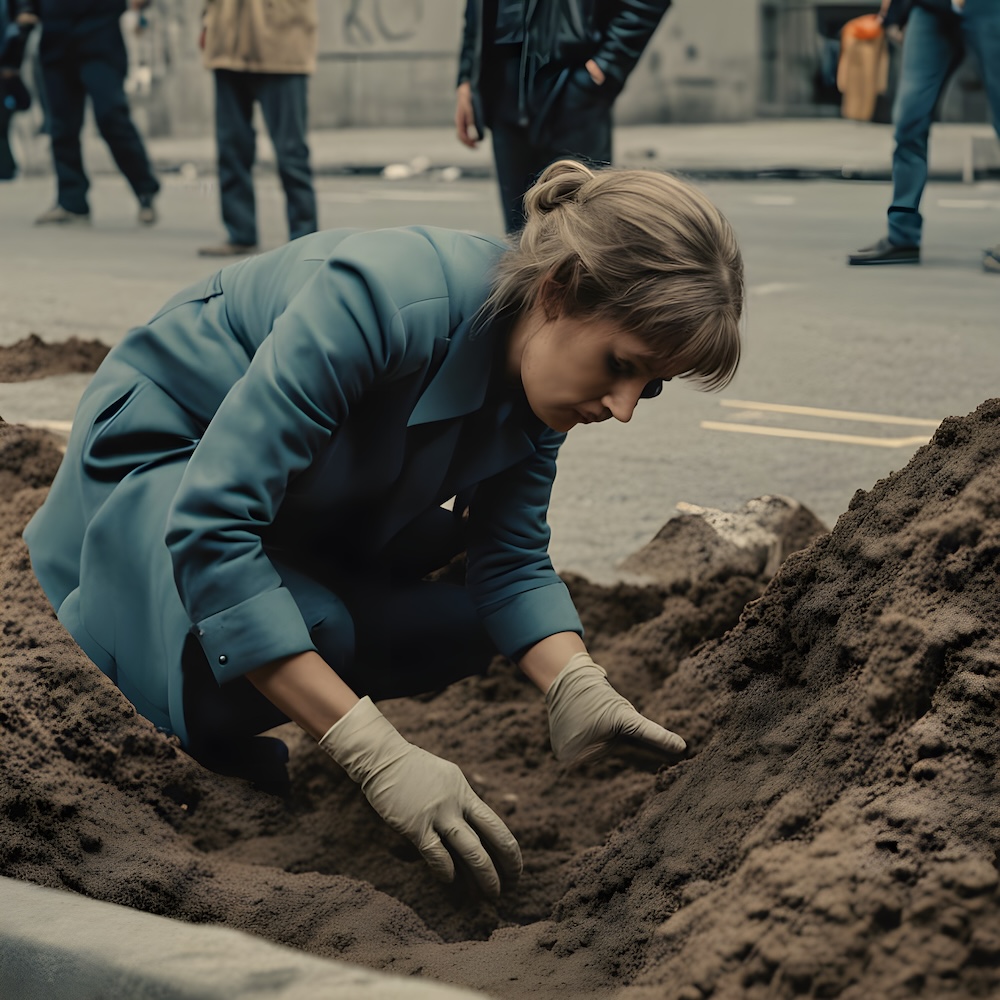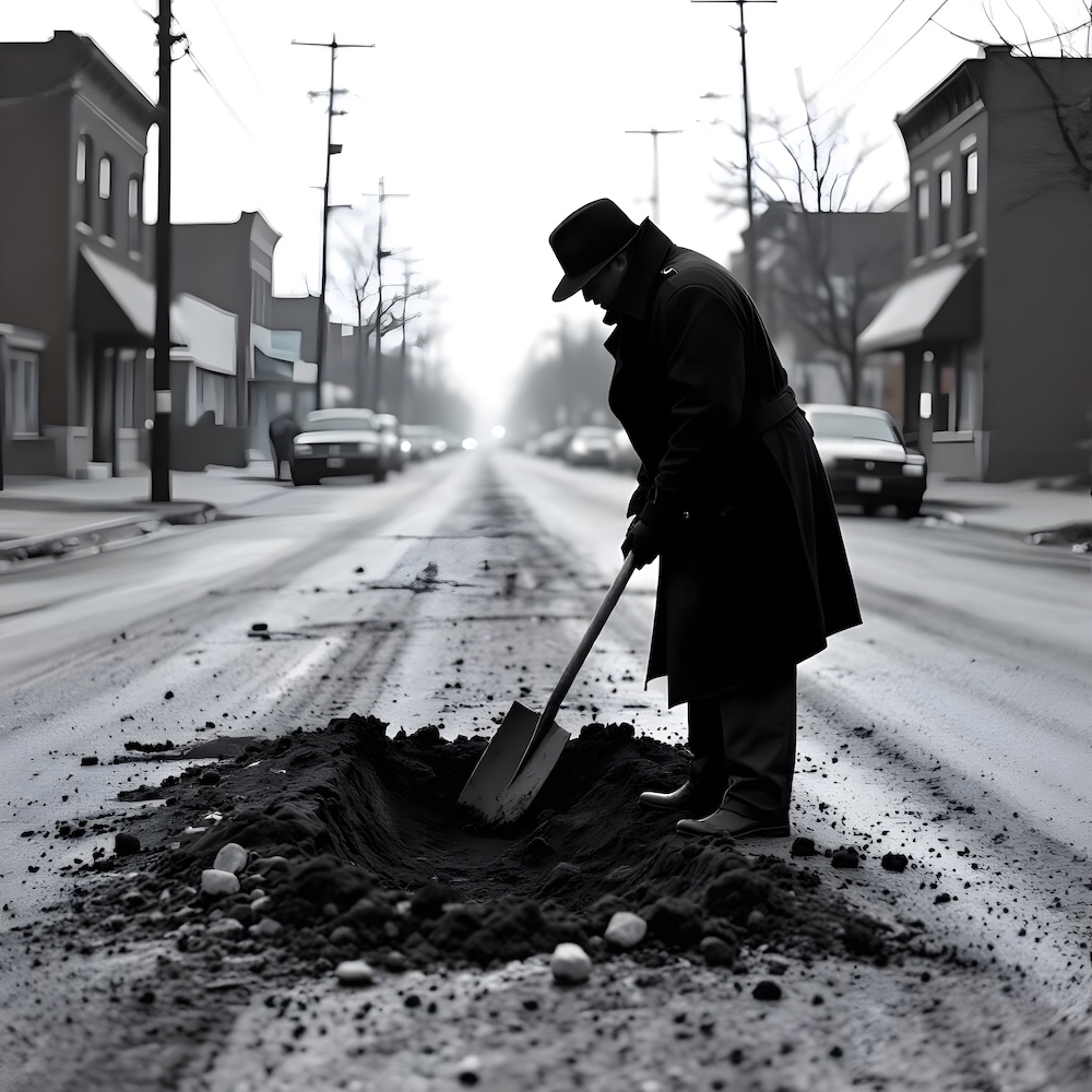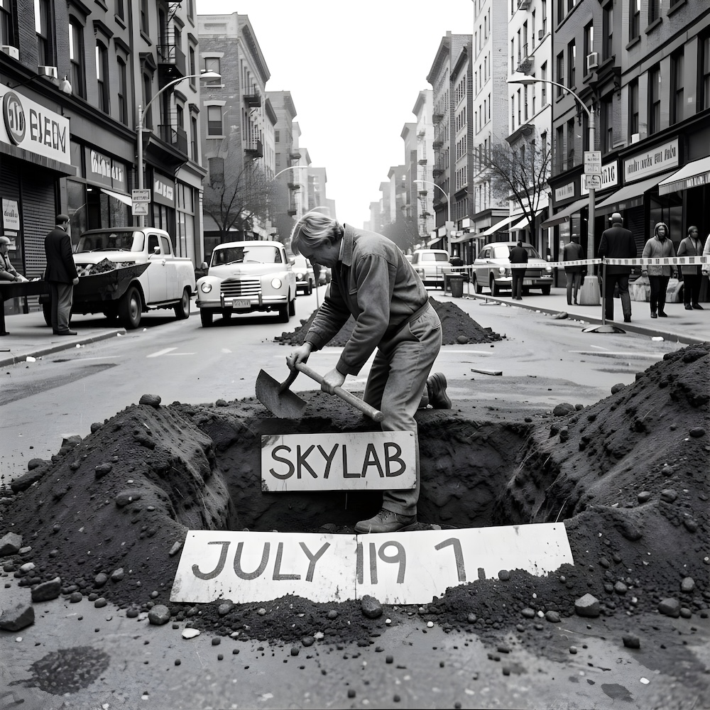Performance art - 11 July 1979 - When the street was being repaired I took advantage of the situation to dig a grave for ‘Skylab’. An AI image for my 'For Skylab' performance. The description above was the prompt for the generated image. An image generated by an AI Machine Learning Model Property of the artist. | ||