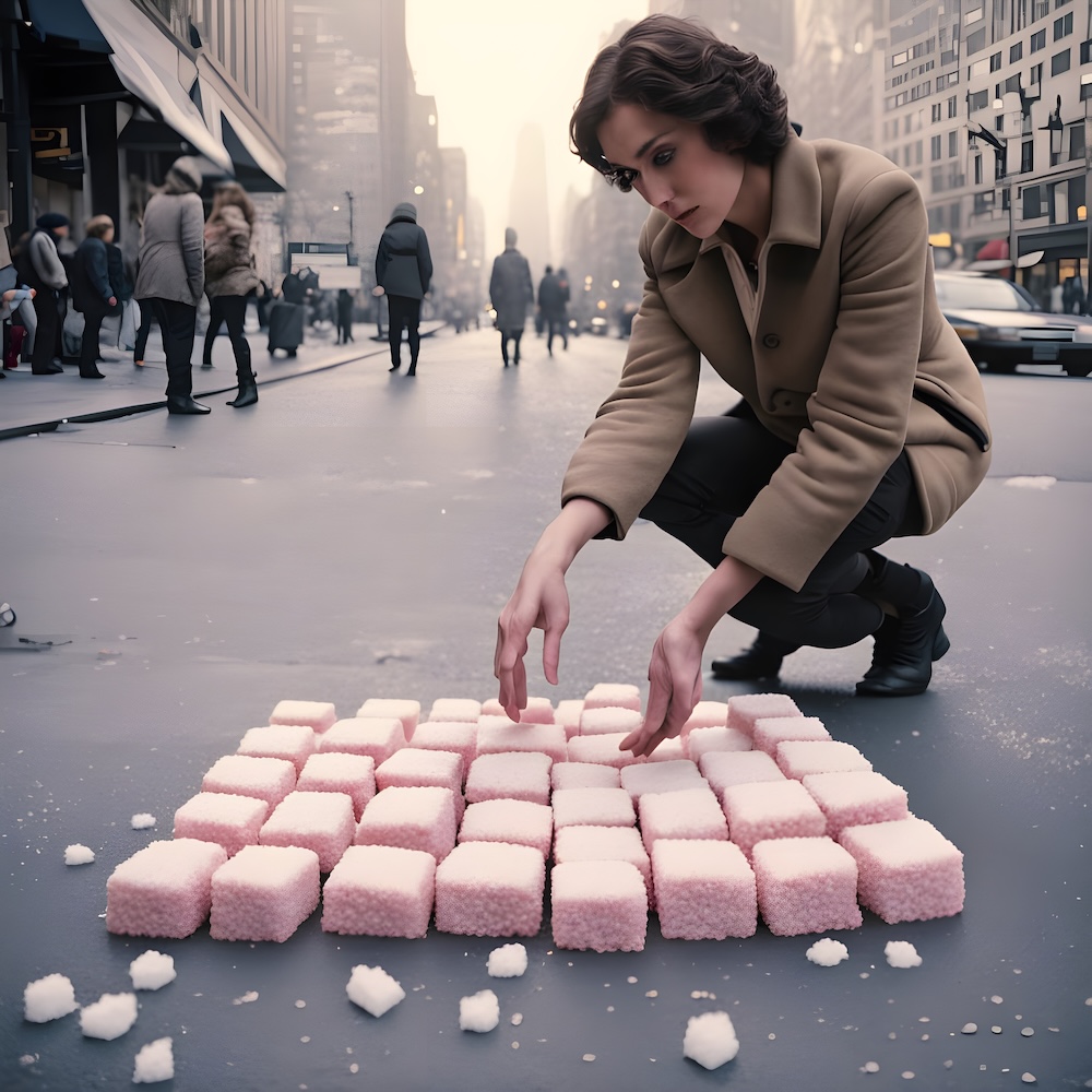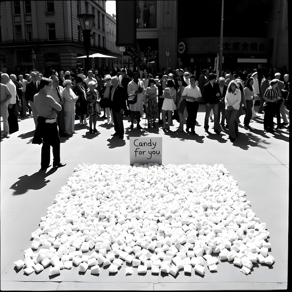 Performance art - 19 July 1979 - On a busy square in the city I laid out about 1000 lumps of sugar in a square. Next to it I wrote “Candy for you”. An AI image for my 'Candy for You' performance. The description above was the prompt for the generated image. An image generated by an AI Machine Learning Model Property of the artist. | ||