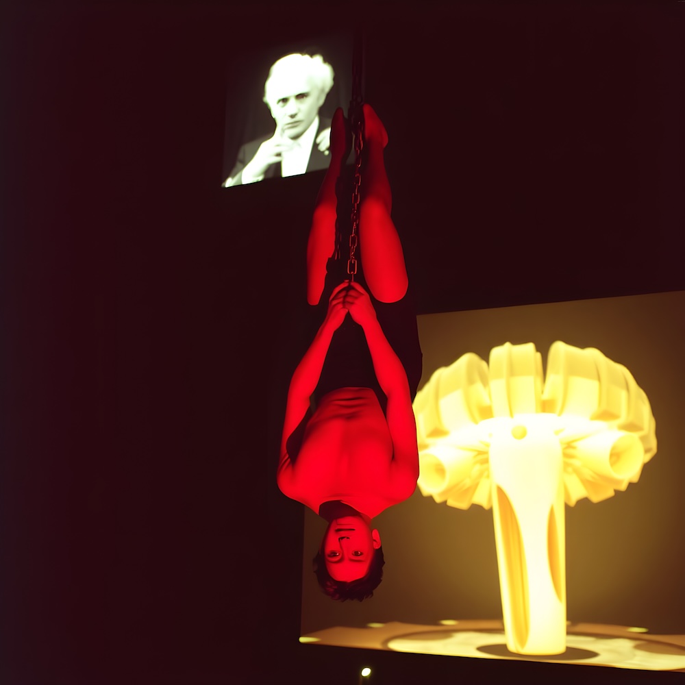 Performance art - 25 February 1984 - I was hanging upside down from a heavy block and tackle while films and slides about Robert Oppenheimer and death were projected onto me. In a microphone I repeated: “Now I am death the destroyer of worlds”. The sound of my voice was electronically distorted into an unearthly grinding and thundering by Anne-Mie Van Kerckhoven. An AI image for my 'Now I Am Death the Destroyer of Worlds - 3' performance. The description above was the prompt for the generated image. An image generated by an AI Machine Learning Model Property of the artist. | ||
