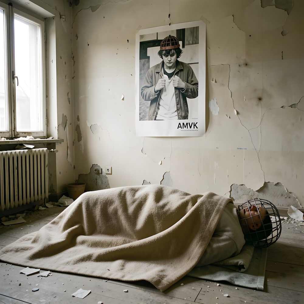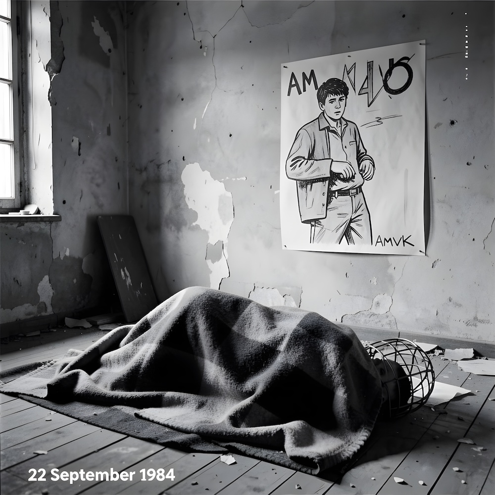 Performance art - 22 September 1984 - In an abandoned house I was laying in a room half covered by a blanket tied up and with my head in a metal cage. On the wall hung a work by AMVK about a kidnapped Italian boy. An AI image for my 'La Chute des Anges Rebelles' performance. The description above was the prompt for the generated image. An image generated by an AI Machine Learning Model Property of the artist. | ||