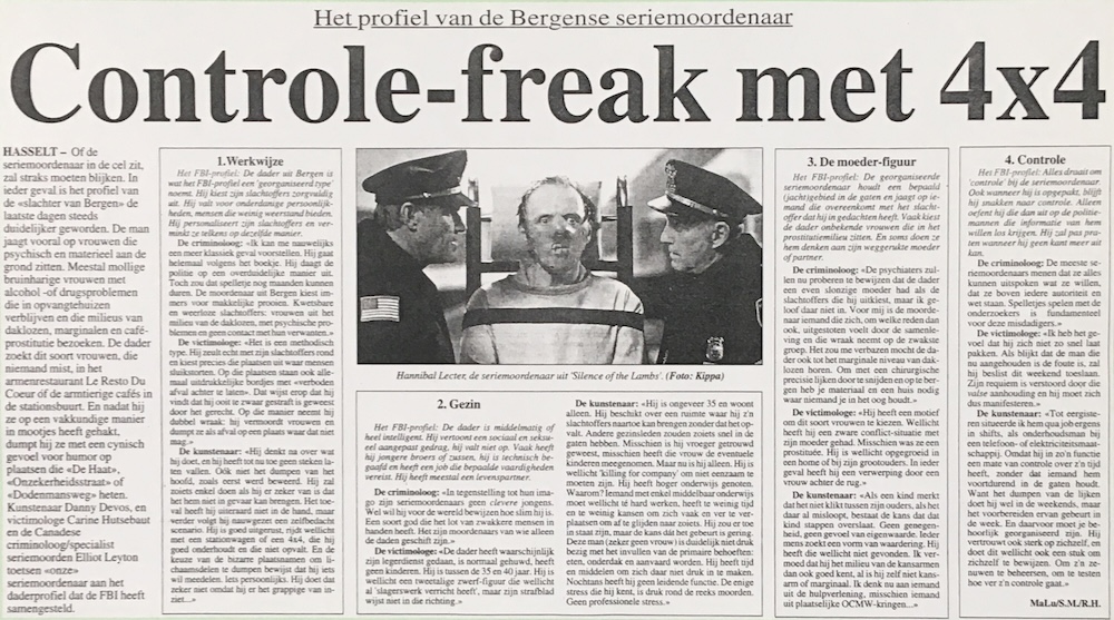 HASSELT - Of de seriemoordenaar in de cel zit, zal straks moeten blijken. In ieder geval is het profiel van de «slachter van Bergen» de laatste dagen steeds duidelijker geworden. De man jaagt vooral op vrouwen die psychisch en materieel aan de grond zitten. Meestal mollige bruinharige vrouwen met alcohol- of drugsproblemen die in opvangtehuizen verblijven en die milieus van deklozen, marginalen en caféprostitutie bezoeken. De dader zoekt dit soort vrouwen, die niemand mist, in het armenrestaurant Le Resto Du Coeur óf de armtierige cafés in de stationsbuurt. En nadat hij ze op een vakkundige manier in mootjes heeft gehakt, dumpt hij ze met een cynisch gevoel voor humor op plaatsen die «De Haat», «Onzekerheidsstraat» of «Dodenmansweg» heten. Kunstenaar Danny Devos, en victimologe Carine Hutsebaut en de Canadese criminoloog/specialist seriemoorden Elliot Leyton toetsen «onze» seriemoordenaar aan het daderprofiel dat de FBI heeft samengesteld.