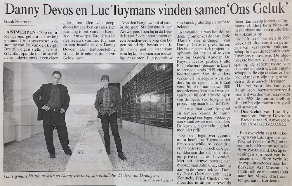 Aanvankelijk was het de bedoeling om enkel de installatie 'Daders van dodingen' van Danny Devos te presenteren. Het is een gigantisch project-in-opbouw dat eerder al te zien was bij Galerij Annette De Keyser. Devos probeert alle Belgische moordenaars in kaart te brengen sinds 1959, zijn geboortedatum. Van de daders verzamelt hij gegevens en kadert hij de ogen in. In totaal vond hij al de namen van 800 moordenaars. Van een kwart er van bezit hij ook afbeeldingen van de ogen. Voorlopig is het project nog maar klaar tot 1970.