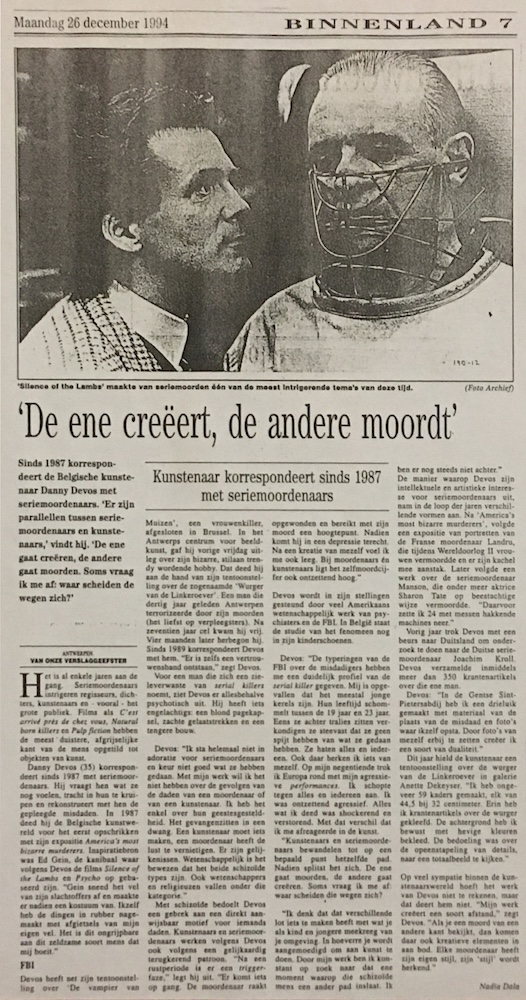 Sinds 1987 korrespondeert de Belgische kunstenaar Danny Devos met seriemoordenaars. 'Er zijn parallellen tussen seriemoordenaars en kunstenaars,' vindt hij. 'De ene gaat creëren, de andere gaat moorden. Soms vraag ik me af: waar scheiden de wegen zich?' Het is al enkele jaren aan de gang Seriemoordenaars intrigeren regisseurs, dichters, kunstenaars en - vooral - het grote publiek. Films als C'est arrivé près de chez vous, Natural born killers en Pulp Fiction hebben de meest duistere, afgrijselijke kant van de mens opgetild tot objekten van kunst. Danny Devos (35) korrespondeert sinds 1987 met seriemoordenaars. Hij vraagt hen wat ze nog voelen, tracht in hun te kruipen en rekonstrueert met hen de gepleegde misdaden. In 1987 deed hij de Belgische kunstwereld voor het eerst opschrikken mel zijn expositie America's most bizarre murderer. Inspiratiebron was Ed Gein, de kannibaal waar volgens Devos de films Silence of the Lambs en Psycho op gebaseerd zijn. "Gein sneed het vel van zijn slachtoffers af en maakte er nadien een kostuum van. Ikzelf heb de dingen in rubber nagemaakt met afgietsels van mijn eigen vel. Het is dit ongrijpbare aan dit zeldzame soort mens dat mij boeit". FBI Devos heeft net zijn tentoonstelling over 'De vampier van Muizen', een vrouwenkiller, afgesloten in Brussel. In het Antwerps centrum voor beeldkunst, gaf hij vorige vrijdag uitleg over zijn bizarre, stilaan trendy wordende hobby. Dat deed hij aan de hand van zijn tentoonstelling over de zogenaamde 'Wurger van de Linkeroever'. Een man die dertig jaar geleden Antwerpen terrorizeerde door zijn moorden (het liefst op verpleegsters). Na zeventien jaar cel kwam hij vrij. Vier maanden later herbegon hij. Sinds 1989 korrespondeert Devos met hem. "Er is zelfs een vertrouwensband ontstaan," zegt Devos. Voor een man die zich een zieleverwante van serial killers noemt, ziet Devos er allesbehalve psychotisch uit. Hij heeft iets engelachtigs: een blond pagekapsel, zachte gelaatstrekken en een tengere bouw. Devos: "Ik sta helemaal niet in adoratie voor seriemoordenaars en keur niet goed wat ze hebben gedaan. Met mijn werk wil ik het niet hebben over de gevolgen van de daden van een moordenaar of van een kunstenaar. Ik heb het enkel over hun geestesgesteldheid. Het gevangenzitten in een dwang. Een kunstenaar moet iets maken, een moordenaar heeft de lust te vernietigen. Er zijn gelijkenissen. Wetenschappelijk is het bewezen dat het beide schizolde types zijn. Ook wetenschappers en religieuzen vallen onder die kategorie." Met schizoïde bedoelt Devos een gebrek aan een direkt aanwijsbaar motief voor iemands daden. Kunstenaars en seriemoordenaars werken voigens Devos ook volgens een gelijkaardig terugkerend patroon. "Na een rustperiode is er een trigger faze," legt bij uit. "Er komt iets op gang. De moordenaar raakt opgewonden en bereikt met zijn moord een hoogtepunt. Nadien komt hij in een depressie terecht. Na een kreatie van mezelf voel ik me ook leeg. Bij moordenaars én kunstenaars ligt het zelfmoordcijfer ook ontzettend hoog." Devos wordt in zijn stellingen gesteund door veel Amerikaans wetenschappelijk werk van psychiaters en de FBI. In België staat de studie van het fenomeen nog in zijn kinderschoenen. Devos: "De typeringen van de FBI over de misdadigers hebben me een duidelijk profiel van de serial killer gegeven. Mij is opgevallen dat het meestal jonge kerels zijn. Hun leeftijd schommelt tussen de 19 jaar en 23 jaar. Eens ze achter tralies zitten verkondigen ze steevast dal ze geen spijt hebben van wat ze gedaan hebben. Ze haten alles en iedereen. Ook daar herken ik iets van mezelf. Op mijn negentiende trok ik Europa rond met mijn agressieve performances. Ik schopte tegen alles en iedereen aan. Ik was ontzettend agressief. Alles wat ik deed was shockerend en verstorend. Met dat verschil dat ik me afreageerde in de kunst. "Kunstenaars en seriemoordenaars bewandelen tot op een bepaald punt hetzelfde pad. Nadien splitst het zich. De ene gaat moorden, de andere gaat creëren. Soms vraag ik me af waar scheiden die wegen zich? *Ik denk dat dat verschillende lot iets te maken heeft met wat je als kind en jongere meekreeg van je omgeving. In hoeverre je wordt aangemoedigd om aan kunst te doen. Door mijn werk ben ik konstant op zoek naar dat ene moment waarop die schizoïde mens een ander pad inslaat. Ik ben er nog steeds niet achter. De manier waarop Devos zijn intellektuele en artistieke interesse voor seriemoordenaars uit nam in de loop der jaren verschillende vormen aan. Na 'America's Most Bizarre Murderer', volgde een expositie van portretten van de Franse moordenaar Landru, die tijdens Wereldoorlog 11 vrouwen vermoordde en er zijn kachel mee aanstak. Later volgde een werk over de seriemoordenaar Manson, die onder meer aktrice Sharon Tate op beestachtige wijze vermoordde. "Daarvoor zette ik 24 met messen hakkende machines neer." Vorig jaar trok Devos met een beurs naar Duitsland om onderzoek te doen naar de Duitse seriemoordenaar Joachim Kroll. Devos verzamelde inmiddels meer dan 350 krantenartikels over die ene man. Devos: "In de Gentse SintPietersabdij heb ik een drieluik gemaakt met materiaal van de plaats van de misdaad en foto's waar ikzelf opsta. Door foto's van mezelf erbij te zetten creëer ik een soort van dualiteit." Dit jaar hield de kunstenaar een tentoonstelling over de Wurger van de Linkeroever in galerie Annette Dekeyser, "Ik heb ongeveer 59 kaders gemaakt, elk van 44,5 bij 32 centimeter. Erin heb ik krantenartikels over de wurger gekleefd. De achtergrond heb ik bewust met hevige kleuren bekleed. De bedoeling was over de opeenstapeling, van details, naar een totaalbeeld te kijken." Op veel sympatie binnen de kunstenaarswereld hoeft het werk van Devos niet te rekenen, maar dat deert hem niet. "Mijn werk creëert een soort afstand." zegt Devos. "Als je een moord van een andere kant bekijkt, dan komen daar ook kreatieve elementen in aan bod. Elke moordenaar heeft zijn eigen stijl, zijn 'stijl' wordt herkend." Nadi