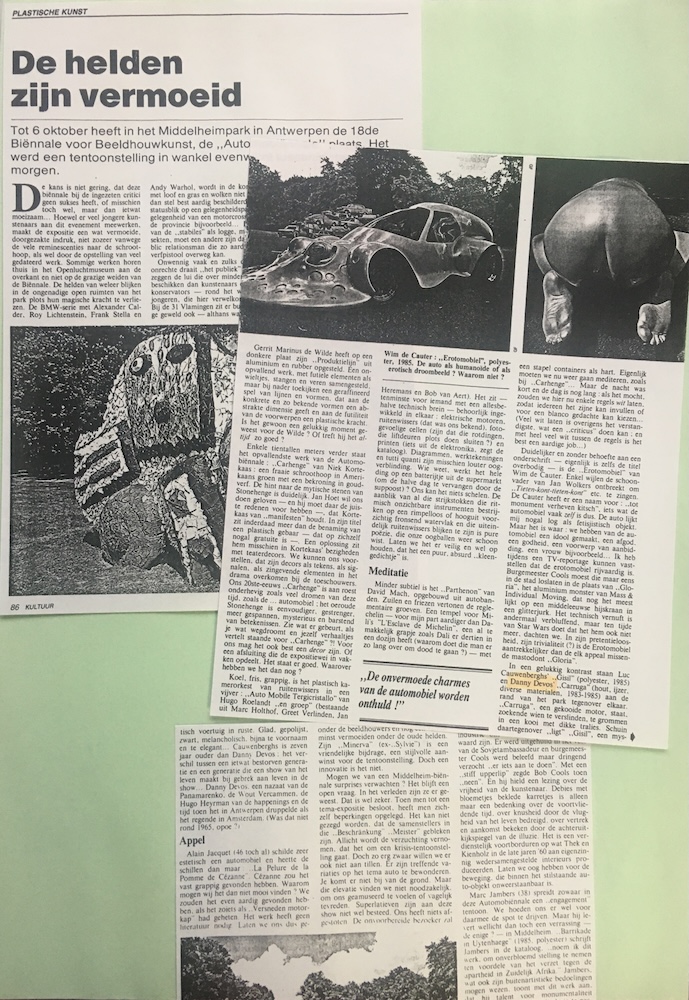 Duidelijker en zonder behoefte aan een onderschrift - eigenlijk is zelfs de titel overbodig - is de "Erotomobiel" van Wim de Cauter. Enkel wijlen de schoonvader van Jan Wolkers ontbreekt om ,Tieten-kont-tieten-kont" etc. te zingen. De Cauter heeft er een naam voor: "tot monument verheven kitsch", iets wat de automobiel vaak zelf is dus. De auto lijkt mij nogal log als fetisjistisch objekt. Maar het is waar: we hebben van de automobiel een idool gemaakt, een afgod, een godheid, een voorwerp van aanbiddding, een vrouw bijvoorbeeld... Ik heb tijdens een TV-reportage kunnen vaststellen dat de erotomobiel rijvaardig is. .... In een gelukkig kontrast staan Luc Cauwenberghs* Gisil" (polyester, 1985) en Danny Devos' „Carruga" (hout, ijzer, diverse materialen, 1983-1985) aan de rand van het park tegenover elkaar. „,Carruga", een gekooide motor, staat. zoekende wien te verslinden, te grommen in een kooi met dikke tralies.