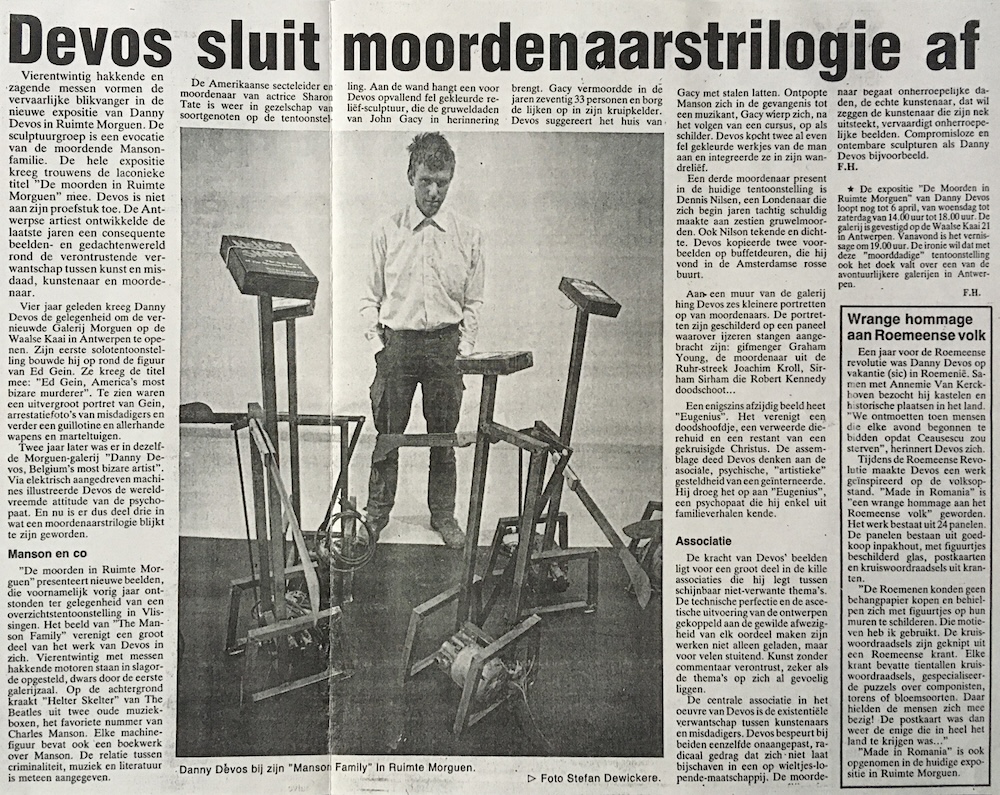 Vierentwintig hakkende en zagende messen vormen de nieuwe expositie van Danny Devos in Ruimte Morguen. De sculptuurgroep is een evocatie van de moordende Mansonfamilie. De hele expositie kreeg trouwens de laconieke titel "De moorden in Ruimte Morguen" mee. Devos is niet aan zin proefstuk toe. De Antwerpse artiest ontwikkelde de laatste jaren en consequente beelden- en gedachtenwereld rond de verontrustende verwantschap tussen kunst en misdaad, kunstenaar en moordenaar. Vier jaar geleden kreeg Danny Devos de gelegenheid om de vernieuwde Galerij Morguen op de Waalse Kaai in Antwerpen te openen. Zijn eerste solotentoonstelling bouwde hij op rond de figur van Ed Gein. Ze kreeg de titel mee: "Ed Gein, America's most bizare murderer". Te zien waren een uitvergroot portret van Gein, arrestatiefoto's van misdadigers en verder en guillotine en allerhande wapens en marteltuigen. Twee jaar later was er in dezelfde Morguen-galerij "Danny Devos, Belgium's most bizare artist" Via elektrisch aangedreven machines illustreerde Devos de wereldvreemde attitude van de psychopaat. En nu is er dus deel drie in wat een moordenaarstrilogie blijkt te zijn geworden. Manson en co "De moorden in Ruimte Morguen" presenteert nieuwe beelden, die voornamelijk vorig jaar ontstonden ter gelegenheid van een overzichtstentoonstelling in Vissingen. Het beeld van "The Manson Family" vernigt een groot deel van het werk van Devos in zich. Vierentwintig met messen hakkende motoren staan in slagorde opgesteld, dwars door de eerste galerijzaal. Op de achtergrond kraakt "Helter Skelter" van The Beatles wit twee oude muziekboxen, het favorite nummer van Charles Manson. Elke machinefigur bevat ook 'een boekwerk over Manson. De relatie tussen criminaliteit, muziek en literatuur is meteen aangegeven, De Amerikaanse secteleider en moordensor was soortgenoten op de tentoonstelling. Aan de wand hangt een voor van John Gacy in herinnering brengt. Gacy vermoordde in de jaren eventig 33 personen en borg de lijken op in zijn kruipkelder. Devos suggereert het huis van Gacy met stalen latten. Ontpopte Search documents and file names ft het volgen van een cursus, op als schilder. Devos kocht twee al even fel gekleurde werkjes van de man aan en integreerde ze in zijn wandrelief. Een derde moordenaar present in de huidige tentoonstelling is Dennis Nilsen, een Londenaar die zich begin jaren tachtig schuldig maakte aan zestien gruwelmoorden. Ook Nilson tekende en dichtte. Devos kopieerde twee voorbeelden op buffetdeuren, die hi yond in de Amsterdamse rosse buurt. Aan- een muur van de galerij hing Devos zes kleinere portretten op van moordenaars. De portretten zijn geschilderd op een paneel waarover ijzeren stangen aangebracht zijn: gifmenger Graham Young, de moordenaar uit de Ruhr-streek Joachim Kroll, Sirham Sirham die Robert Kennedy doodschoot….. Een enigszins afzijdig beeld heet "Eugenius". Het verenigt een doodshoofdje, een verweerde dierehuid en een restant van een gekruisigde Christus. De assemblage deed Devos denken aan de asociale, psychische, "artistieke" gesteldheld van een geinterneerde Hij droeg het op aan "Eugenius" een psychopaat die hij enkel wit familieverhalen kende Associatie De kracht van Devos' beelden ligt voor een groot deel in de kille associaties die hij legt tussen schijnbaar niet-verwante thema's. De technische perfectie en de ascetische uitvoering van de ontwerpen gekoppeld aan de gewilde afwezigheid van elk oordeel maken zin werken niet alleen geladen, maar voor velen stuitend. Kunst zonder commentaar verontrust, zeker als de thema's op zich al gevoelig liggen. De centrale associatie in het oeuvre van Devos is de existentiële verwantschap tussen kunstenaars en misdadigers. Devos bespeurt bij beiden eenzelfde onaangepast, radicaal gedrag dat zich • niet laat biischaven in een op wieltjes-lopende-maatschappij. De moordenaar begaat onherroepelijke daden, de echte kunstenaar, dat wil zeggen de kunstenaar die zijn nek witsteekt, vervaardigt onherroepelijke beelden. Compromisloze en ontembare sculpturen als Danny Devos bijvoorbeeld. F.H. * De expositie "De Moorden in Ruimte Morguen" van Danny Devos loopt nog tot 6 april, van woensdag tot zaterdag van 14.00 ur tot 18.00 ur. De galerij is gevestigd op de Waalse Kaai 21 in Antwerpen. Vanavond is het vermissage om 19.00 wur. De ironie wil dat met deze "moorddadige" tentoonstelling ook het doek valt over een van de avontuurlijkere galerijen in Antwerpen. F.H.
