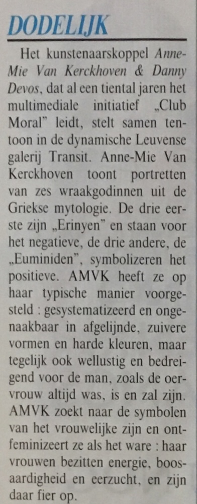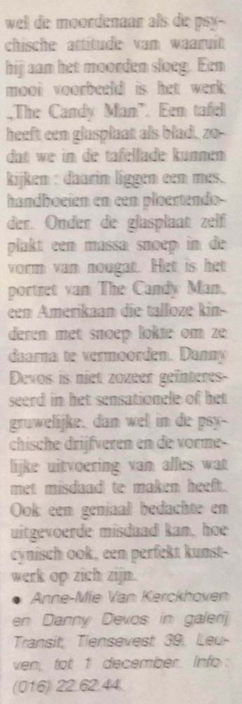 Het kunstenaarskoppel AnneMie Van Kerckhoven & Danny Devos, dat al een tiental jaren het multimediale initiatief „Club Moral" leidt, stelt samen tentoon in de dynamische Leuvense galerij Transit. Anne-Mie Van Kerckhoven toont portretten van zes wraakgodinnen uit de Griekse mytologie. De drie eerste zijn „Erinyen" en staan voor het negatieve, de drie andere, de „Euminiden", symbolizeren het positieve. AMVK heeft ze op haar typische manier voorgesteld : gesystematizeerd en ongenaakbaar in afgelijnde, zuivere vormen en harde kleuren, maar tegelijk ook wellustig en bedreigend voor de man, zoals de oervrouw altijd was, is en zal zijn. AMVK zoekt naar de symbolen van het vrouwelijke zijn en ontfeminizeert ze als het ware : haar vrouwen bezitten energie, boosaardigheid en eerzucht, en zijn daar fier op. Het werk van Danny Devos kadert binnen de „true crime art" : hij prezenteert zes portretten van seriemoordenaars in de vorm van tafelinstallaties. De hallucinante beelden tonen zowel de moordenaar als de psychische attitude van waaruit big aan bet moorden sloeg. Een mooi voorbeeld is het werk „The Candy Man". Een tafel heeft een glasplaat als blad, zodat we in de tafellade kunnen kijken : daarin liggen een mes, handboeien en een ploertendoder. Onder de glasplaat zelf plakt een massa snoep in de vorm van nougat. Het is het portret van The Candy Man, een Amerikaan die talloze kinderen met snoep lokte om ze daama te vermoorden. Danny Devos is niet zozeer geinteresseerd in het sensationele of het gruwelijke dan wel in de psychische drijfveren en de vormelijke uitvoering van alles wat met misdaad te maken heeft. Ook een geniaal bedachte en uitgevoerde misdaad kan, hoe cynisch ook, een perfekt kunstwerk op zich zijn. • Anne-Mie Van Kerckhoven en Danny Devos in galerie Transit, Tiensevest 39. Leuven, tot 1 december info : (016) 22 62 44