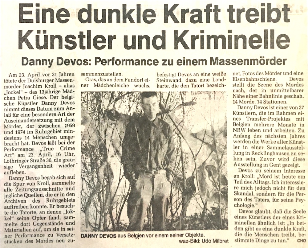 Am 23. April vor 31 Jahren tötete der Duisburger Massenmörder Joachim Kroll - alias „Jockel" - das 13jährige Mädchen Petra Giese. Der belgische Künstler Danny Devos nimmt dieses Datum zum Anlaß für eine besondere Art der Auseinandersetzung mit dem Mörder, der zwischen 1959 und 1974 im Ruhrgebiet mindestens 14 Menschen umgebracht hat. Devos läßt bei der Performance „True Crime Art" am 23. April, 16 Uhr, Lothringer Straße 36, die grausige Vergangenheit wieder aufleben. Danny Devos begab sich auf die Spur von Kroll, sammelte alle Zeitungsausschnitte und jegliche Quellen, die er in den Archiven des Ruhrgebiets auftreiben konnte. Er besuchte die Tatorte, an denen „Jokkel" seine Opfer fand, sammelte dort Gegenstände und Materialien auf, um sie in seiner Performance zu Versatzstücken des Mordes neu zusammenzustellen. Gras, das an dem Fundort einer Mädchenleiche wuchs, befestigt Devos an eine weiße Steinwand, dazu eine Landkarte, die den Tatort bezeichnet, Fotos des Mörder und eine Eisenbahnschiene. Devos stellt die Szene des Mordes nach, der in unmittelbarer Nähe einer Bahnlinie geschah. 14 Morde, 14 Stationen. Danny Devos ist einer von 27 Künstlern, die im Rahmen eines Transfer-Projektes mit Belgien mehrere Monate in NRW leben und arbeiten. Zu Anfang des nächsten Jahres werden die Werke aller Künstler in einer Sammelausstellung in Recklinghausen zu sehen sein. Zuvor wird diese Ausstellung in Gent gezeigt. Devos zu seinem Interesse an Kroll: „Mord ist heute ein Teil des Alltags. Ich interessiere mich jedoch nicht für den Skandal, sondern für die Person des Täters, für seine Psychologie." Devos glaubt, daß die Seele eines Künstlers der eines Kriminellen ähnlich ist: „In beiden gibt es eine dunkle Kraft, die die Menschen treibt, bestimmte Dinge zu tun." CHO