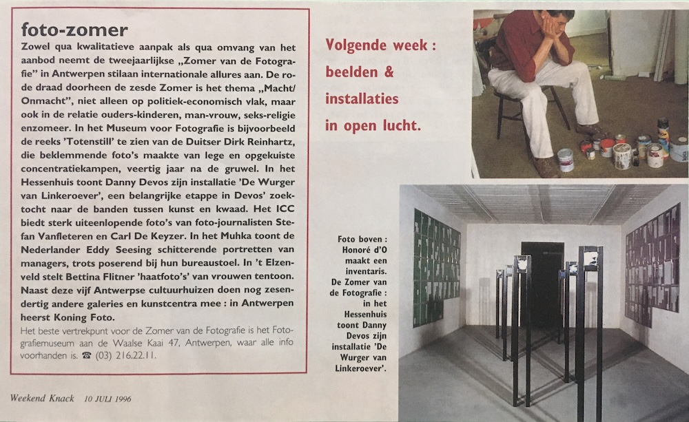 Zowel qua kwalitatieve aanpak als qua omvang van het aanbod neemt de tweejaarlijkse „Zomer van de Fotografie" in Antwerpen stilaan internationale allures aan. De rode draad doorheen de zesde Zomer is het thema „Macht/ Onmacht", niet alleen op politiek-economisch vlak, maar ook in de relatie ouders-kinderen, man-vrouw, seks-religie enzomeer. In het Museum voor Fotografie is bijvoorbeeld de reeks 'Totenstill' te zien van de Duitser Dirk Reinhartz, die beklemmende foto's maakte van lege en opgekuiste concentratiekampen, veertig jaar na de gruwel. In het Hessenhuis toont Danny Devos zijn installatie 'De Wurger van Linkeroever', een belangrijke etappe in Devos' zoektocht naar de banden tussen kunst en kwaad. Het ICC biedt sterk uiteenlopende foto's van foto-journalisten Stefan Vanfleteren en Carl De Keyzer. In het Muhka toont de Nederlander Eddy Seesing schitterende portretten van managers, trots poserend bij hun bureaustoel. In 't Elzenveld stelt Bettina Flitner 'haatfoto's' van vrouwen tentoon. Naast deze vijf Antwerpse cultuurhuizen doen nog zesendertig andere galeries en kunstcentra mee : in Antwerpen heerst Koning Foto.