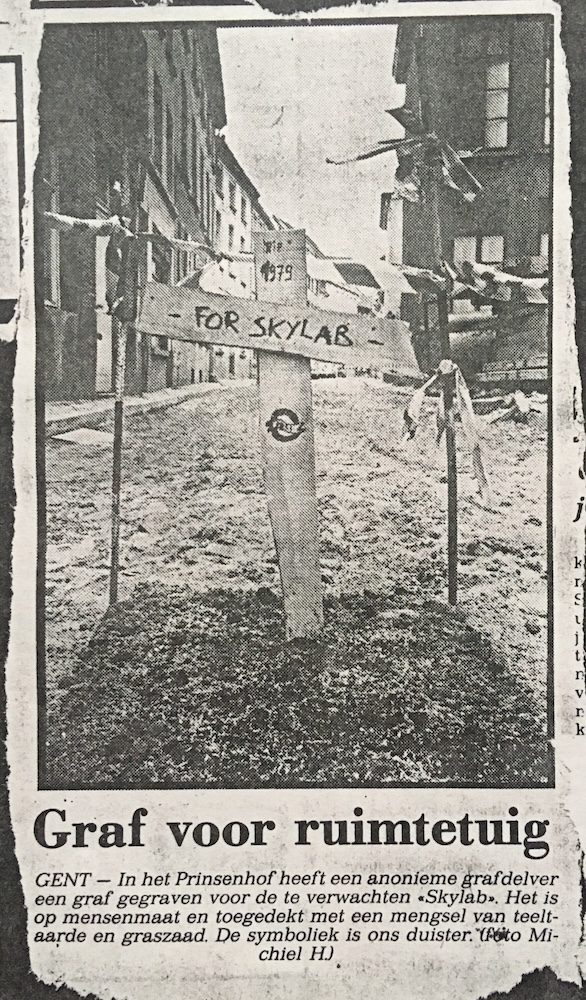 GENT - In het Prinsenhof heeft een anonieme grafdelver een graf gegraven voor de te verwachten "Skylab". Het is op mensenmaat en toegedekt met een mengsel van teeltaarde en graszaad. De symboliek is ons duister. (foto Michiel H.)