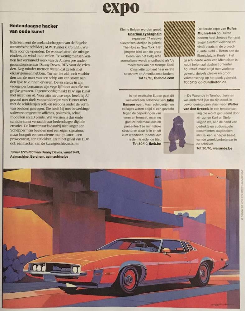 ledereen kent de zeelandschappen van de Engelse schilder J.M.W. Turner (1775-1851), William voor de vrienden. De woeste baren, de mistige einders, de wind in de zeilen. Te weinig mensen kennen het verzameld werk van de Antwerpse undergroundkunstenaar Danny Devos, DDV voor de vrienden. Nog minder mensen weten dat ze iets met elkaar gemeen hebben. Turner liet zich ooit vastbinden aan de mast van een schip om een storm aan den lijve te kunnen ervaren. Devos stelde in zijn vroege performances zijn vege lijf bloot aan alle mogelijke gevaren. Tegenwoordig maakt DDV zijn kunst met inzet van Al. Voor zijn nieuwe expo heeft hij Al gevoed met titels van schilderijen van Turner (niet met de schilderijen zelf) en respons onder de vorm van beelden gekregen. Die heeft hij met bewerkingssoftware omgezet in affiches, polaroids, schaalmodellen en 3D prints. Wat we zien is dus oude schilderkunst vertaald naar hedendaagse digitale creaties. De kunstenaar is daarbij niet langer een 'schepper' van beelden met een eigen signatuur, maar hooguit een anonieme manipulator - een provocateur, een uitlokker. En in het geval van DDV ook een hacker van de kunstgeschiedenis. (DI) Everyone is familiar with the seascapes of English painter J.M.W. Turner (1775-1851), known as William to his friends. The raging waves, the misty horizons, the wind in the sails. Too few people are familiar with the collected works of Antwerp underground artist Danny Devos, known as DDV to his friends. Even fewer people know that they have something in common. Turner once had himself tied to the mast of a ship so he could experience a storm firsthand. In his early performances, Devos exposed his frail body to all kinds of dangers. Nowadays, DDV creates his art with the help of AI. For his new exhibition, he fed AI with titles of Turner's paintings (not the paintings themselves) and received responses in the form of images. He used editing software to convert these into posters, Polaroids, scale models, and 3D prints. What we see, then, is old painting translated into contemporary digital creations. The artist is no longer a ‘creator’ of images with his own signature, but at most an anonymous manipulator—a provocateur, a instigator. And in the case of DDV, also a hacker of art history. (DI) Turner 1775-1851 van Danny Devos, vanaf 14/9, Aaimachine, Berchem, aaimachine.be ![]() | ||