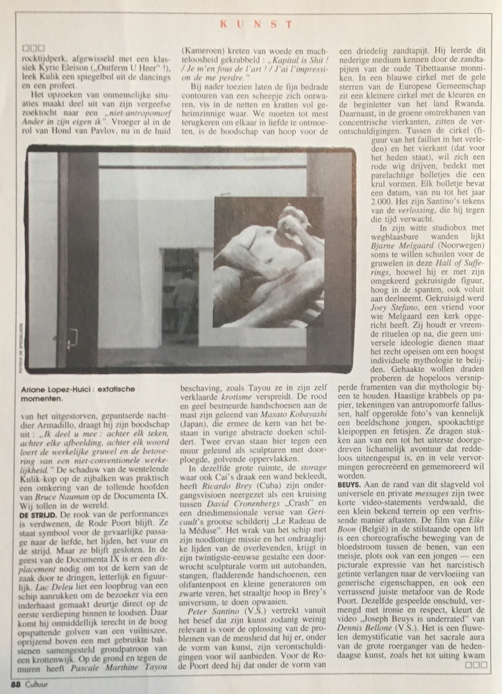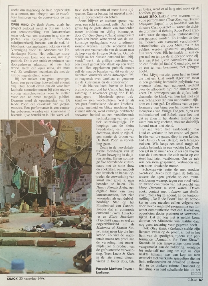 Stilaan werd het aardedonker, bar koud en verlaten in het casino vol gaten. In één van die gaten, diep in een kelder, had Danny Devos (België) zich teruggetrokken. Wie langs een smal trapje afdaalde belandde in een vochtig kot. Door een gat in de muur keek je als een voyeur naar de kunstenaar die zich naakt op een stoel had laten vastbinden. Om de nek was een riem gespannen, verbonden aan een soort draaiende motor. Schoksgewijs zette de met modder overdekte Devos zich tegen de foltering teweer, de ogen gericht op een muurschildering waarop, tegen een rood veld, de zwarte contouren van het gezicht van Marc Dutroux te zien waren. Devos zoekt contact met 'daders van dodingen', zoals hij ze noemt. In de tentoonstelling 'De Rode Poort' kan de bezoeker in twee metalen cellen volgens een door Devos ingesteld programma een Internet-communicatie met een levenslang opgesloten doder proberen te verwezenlijken. Dat dit nog niet is gelukt komt doordat het Ministerie van Justitie daar nog geen toelating voor gegeven heeft.
