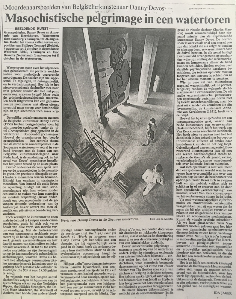 Grensgebieden. Danny Devos en Annemie van Kerckhoven. Watertoren Oost-Souburg/Vlissingen, tot 26 augustus. Onder het thema vallen tevens exposities van Philippe Tonnard (Belgie), 4 augustus tot 1 oktober in dépendance Walstraat 58/60, Vlissingen en Eric Brandts (Nederland), 1 september tot 8 oktober in de Watertoren. Watertorens staan over het algemeen niet geboekstaafd als perfecte werklokaties voor methodisch opererende moordenaars. De nadelen zijn snel opgesomd. Te afgelegen, te ontoegankelijk en te verdachtmakend. Hoe lok je het nietsvermoedende slachtoffer mee naar zon gebouw zonder dat het mikpunt onderweg argwaan krijgt? Maar zoals de criminologiegeschiedenis meermalen heeft uitgewezen kan een gepassioneerde moordenaar niet alleen uiterst inventief maar tevens zeer beminnelijk zijn en zijn slachtoffer toch zover krijgen. Dergellike gedachtengangen moeten de Belgische kunstenaar Danny Devos (1959) hebben beziggehouden toen hij zijn „murder sculptures" onder de titel Grensgebieden ging opstellen in de watertoren Oost-Souburg/Vlissingen. Hoewel de organisatoren het begrip grensgebieden - het centrale thema van de derde serie zomerexposities in de Souburgse watertoren - vooral in verband brengen met de komst van een Belgische kunstenaarsdelegatie naar Nederland, is de aanduiding ook in het geval van Devos' messcherpe installaties het juiste woord op de juiste plaats. Devos' onderzoeksterrein spitst zich toe op de grensgebieden in de menselijke geest. Om precies te zijn op die onverklaarbare momenten waarin beminnelijkheid kan omslaan in strategische moordlust. Van iemand die zoals Devos de opvatting huldigt dat men seriemoordenaars niet kan volgen zonder een studie te maken van hun materiële en mentale wapentuig (Devos onderhoudt een correspondentie met de gevangen zittende verkrachter van de Antwerpse linker oever) zou men eigenlijk een piëteitvolle benadering verwachten. Toch vermijdt de kunstenaar te enen male in de huid te kruipen van de crimipsycholoog, zoals hij zich ook verre houdt van elke vorm van morele verontwaardiging. Met de trefzekerheid van een nauwgezette archivaris registreert hij de handelingen van bestiaal te werk gaande excessievelingen en laat daarbij namen van slachtoffers en lokaties niet onvermeld. De tot nu toe verzamelde morbiditeiten zijn chronologisch tot op de dag nauwkeurig gebundeld in archiefmappen, waarvan Devos als betreft het alledaagse consumptieartikelen gecomprimeerde kalenders voor de verkoop heeft gemaakt (de kalender 90 killers for the 90s is voor 17,50 gulden te koop). In volgorde van het hoogste aantal slachtoffers volgen de bijnamen van de likzuchtigen elkaar op: the Yorkshire Ripper, the Hillside Stranglers, the Devil's Moor Murderer, the Werewolf of Amiens, met honderden andere bloeddorstige namen samengebracht onder de gortdroge titel Birth (+) Fact (x) Death (-) (Work in progress since 1985). Devos lijdt kennelijk aan een obsessie, die hij ogenschijnlijk even goed in de hand heeft als seriemoordenaars hun slachtoffers. Maar na de encyclopedische opsomming hangt de kunstenaar zijn objectiviteit aan de wilgen. Hij gaat „zijn" moordenaars interpreteren. Landru bijvoorbeeld, een eenzaam gesoigneerd heertje dat in 1917 elf vrouwen in een kachel smoorde, wordt verzinnebeeld door roestige, op een sokkel geplaatste, kacheldelen. Kolen hebben plaatsgemaakt voor een luidspreker: een rustige mannenstem richt het woord tot een vrouw, terwijl op de achtergrond snerpend gekrijs klinkt. The Beast of Jersey, een houten doos waaruit draaiende en lokkende kippepoten steken, maakt ondanks de abstrahering maar al te zeer de scabreuze praktken van een kinderlokker duidelijk. Devos' masochistische pelgrimage — naarmate men de top van de watertoren nadert. krijgt de minutieuze exploratie van extremiteiten deze bijsmaak — eindigt onder het dak in een bedrijvig slachthuis, waar motorisch bestuurde slagersmessen op het ritme van Helter Skelter van The Beatles elke vorm van afschuw en walging in de kiem smoren. Het kabinet van Caligari, of voor wie wil het laboratorium van Jekyll en Hyde, is hier hoog boven het Zeeuwse platteland tot hilarische proporties teruggebracht. De meest bizarre bijkomstigheid is wellicht dat de seriemoordenaar (in dit geval de rituele slachter Charles Manson) wordt verontschuldigd door niemand minder dan de exploiterende kunstenaar Danny Devos. De horrorshow is over en als er al een moraal zou zijn dan klinkt die als volgt: ze konden er niets aan doen, ze waren immers door de duivel bezeten. In elk geval huldigt Devos met dit arrangement op openhartige wijze zijn stelling dat seriemoordenaars en kunstenaars elkaar de hand kunnen schudden. Beiden zouden over dezelfde psychopatische karakters beschikken, die telkens opnieuw moeten toegeven aan extreme krachten om 20 tot het ultieme moment te geraken. Wie in deze val van muizenissen trapt, zal waarschijnlijk ook de portrettengalerij rondom de walsende slachtmachine aan Devos toeschrijven. De uit snelle expressionistische penseelstrepen opgebouwde gezichten horen niet bii Devos' moordenaarslijsten, maar bestaat uit vrienden en kennissen die zijn levensgezellin, de kunstenares Annemie van Kerckhoven (1951), heeft vereeuwigd. Hoewel het bij Grensgebieden om een tweemansexpositie gaat, waarin aan beide kunstenaars een evenwaardige plaats is toebedeeld, blijft het werk van Van Kerckhoven verscholen in zichzelf. Het heeft niets te maken met het feit dat zij zich in het geheel niet beroept op thrilleriaanse effecten of omdat haar handelsmerk minder in het oog loopt. Gebruikmakend van een agressiet, fluorescerend kleurengamma laat zij met een zekere hardhandigheid steeds terugkerende thema's als genot, extase, vernietigingsdrift, starre waardenstelsels over kolossale doeken tuimelen. Wat zich openbaart is niet veel meer dan een sjabloneske wereld waarin een vrouw haar overongelijkt zijn over van alles en nog wat aan de beschouwer wil opdringen. Waar Devos zich in zwijgen ult en zijn publi