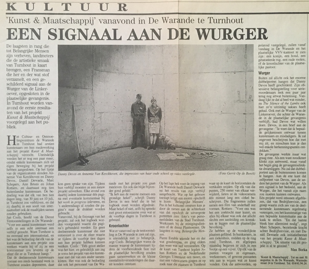 De laagsten in rang die tot Belangrijke Mensen zijn verheven, landmeters die de artistieke smaak van Turnhout in kaart brengen, een Fransman die her en der wat stof verzamelt, en een geschilderd signaal aan de Wurger van de Linkeroever, opgesloten in de plaatselijke gevangenis. In Turnhout worden vanavond de eerste resultaten van het projekt Kunst & Maatschappij voorgelegd aan het publiek. Het Cultuur- en Ontmoetingscentrum de Warande in Turnhout had zestien kunstenaars om hun medewerking aan het projekt Kunst & Maatschappij verzocht. Uiteindelijk werden het er nog een paar meer, omdat enkele kunstenaars zich uit eigen beweging bij het projekt hebben aangesioten. Op het lijstje van de organizatoren stonden Annemie Van Kerckhoven en Danny Devos, Daniel Dewaele, Marc Schepers, Ann Boons en Johan Rottiers, en daamnaast nog tien buitenlandse kunstenaars. De bedoeling was dat elk van hen tien dagen lang. van 30 juni tot 10 juli, in Turnhout zou verblijven, en dat zij daarbij in een soort van internaatssfeer ook de maaltijden samen zouden gebruiken Jan Cools, hoofd van de Dienst Tentoonstellingen in De Warande : "Voor een aantal kunstenaars werd zelfs in een echt internaat een verblijf gezocht. Want Turnhout is nu eenmaal een internaatsstad, en het was de bedoeling dat elk van de kunstenaars aan een projekt zou werken waarin hij of zij ze een kommentaar zou leveren op de sfeer die er in Tumbout hangt." Dat de deelnemende kunstenaars zomaar een reeds bestaand werk in Tumhout zouden deponeren, daar kon geen sprake van zijn. Tijdens hun verblijf moesten ze een nieuw projekt uitwerken. Elke avond zou daarbij iedere kunstenaar één pagina met eventuele kommentaar bij het work in progress inleveren, en 's anderendaags al zouden die pagina's naar de drukker worden gebracht. Vanavond, bij de finissage van het projekt, zal ook het logboek worden voorgesteld waarin die pagina's gebundeld werden. En geen deelnemende kunstenaar die niet entoesiast is over de sfeer waarin ze tijdens de voorbije tien dagen aan hun projekt hebben kunnen werken. Cools: "Eén groot atelier was het hier, en geleidelijk aan zag je soms het projekt van een kunstenaar met dar van een ander samenklitten. Het was ook de bedoeling dat ook het personeel van De Warande met het projekt zou gaan meeleven. En ook dat blijkt bijzonder goed gelukt." "Ik heb aan de meeste mensen een grondige hekel" , schrijft Danny Devos in een brief die in het logboek moet worden afgedrukt. Maar hekel of niet, zelfs hij spreekt met groot entoesiasme over wat er de voorbije dagen in Turnhout is gebeurd. Kroonluchter Wat er vanavond op de tentoonstelling in De Warande te zien zal zijn, is uiteindelijk niet z0 belangrijk, zegt Cools. Belangrigker waren de manier waarop de kunstenaars tijdens de voorbereidende faze met de plaatselijke bevolking zouden gaan samenwerken en de kleine mentaliteitsveranderingen die daaruit konden ontstaan. Op het lage hek voor de ingang van Highlights and Notes niel Dewaele nu net tesiau van zijn verblijf aangebracht. Wie op het gebouw toestapt krijgt een enorm opschrift te lezen: "Belangrijke Mensen' Pas in het kultureel centrum kun je door de ramen aan de achterkant van dat opschrift de uitvergrote portretten zien: foto's van personeelsleden van de Stad Turnhout. Werkzaam bij de reinigingsdiensten of de dienst Plantsoenen, De laagsten in rang Belangrijke Mensen. Pierre Estable lekende her en der wat goudstrepen, en ging elders dan weer wat stof verzamelen. Op de kaart van Turnhout legden Johan Rottiers en de Nederlander Georges Uittenhout een raster, en met een videocamera gingen ze op zock naar die plaatsen in Turnhout waar op de kaart de horizontalen de vertikalen snijden. Op elk van die punten, 250 meter van elkaar verwijderd, lieten ze de videocamera één minuut lang een cirkel beschrijven. Die fragmenten zullen samen een film van anderhalf uur vormen. Rottiers: "Voor ons was het een zoektocht naar kunst, en alles bij elkaar was ook dat allicht slechts een aanleiding om kontakten te leggen met de plaatselijke bevolking. Ze hebben op de wonderlijkste plaatsen gefilmd. In huiskamers, in een ziekenhuis, midden op de ring rond Tumnhout, en afgelopen maandag begaven ze zich in een bootje op een vijver. Op elk van de punten vroegen ze eigenaars, werknemers, of gewone passanten iets aan te wijzen wat ze kunst vonden. Ook die antwoorden, op polaroid vastgelegd, zullen vanaf vandaag in De Warande en het plaatselijke VVV-kantoor te zien zijn: een konijn, een hond, een getatoeëerde rug, een oude molen, of de kroonluchter van de plaatselijke pastoor. Wurger Buiten zal allicht ook het enorme dubbelportret hangen dat Danny Devos heeft geschilderd. Zijn obsessieve belangstelling voor seriemoordenaars leek een paar jaar terug nog ietwat buitenissig. Vandaag lijkt ze dat al heel wat minder, nu The Silence of the Lambs ook hier zo'n uitzinnig sukses heeft gehad. Ook met de Wurger van de Linkeroever, die achter de Warande in de plaatselijke gevangenis verblijft, had Devos wat willen doen. Devos, in een brief aan de gevangene : "Je weet dat ik bepaalde gelijkenissen ontwaar tussen kunstenaars en misdadigers. Ik zal ongeveer beschrijven hoe dat met mij zit, en misschien kun je dan wel enkele herkenningspunten ontdekken." De gevangene werkte maar wat graag mee. Als een ware noodkreet klinkt zijn antwoord, maar vanaf het begin ging de gevangenisdirektie dwarsliggen. Nu zal dat dubbelportret aan de buitenmuren komen te hangen. Aan de ene kant dat zelfportret van Devos, aan de andere het portret van de Wurger. Als een signaal is het bedoeld, aan de Wurger, die her vanuit zijn raam zou moeten kunnen ontwaren. Eén projekt werd intussen afgeblazen, dat van Bedrijfsrevisie, een groep waarin zich zes van de deelnemende kunstenaars regelmatig verenigen, om het kunstmatige van een bepaalde kunstsituatie aan de kaak te stellen. "En dat laatste bleek hier allerminst nodig", zegt Mare Schepers, bezielende kracht achter Bedrijfsrevisie, en met Daniël Dewael