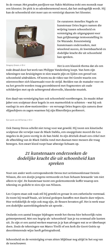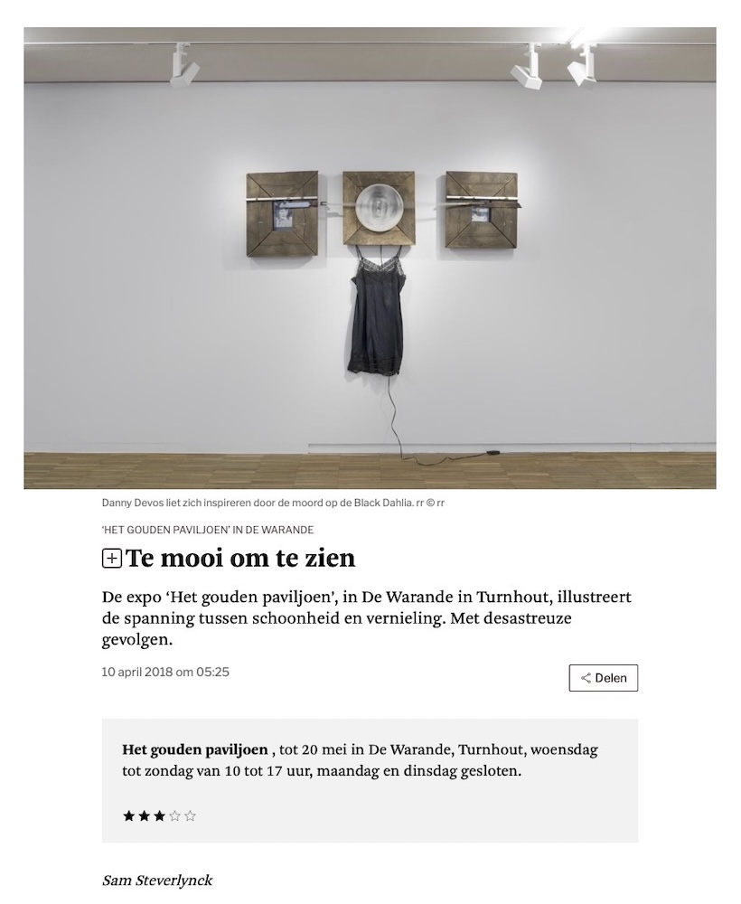 Danny Devos liet zich inspireren door de moord op de Black Dahlia. In de roman Het gouden paviljoen van Yukio Mishima trekt een monnik naar een klooster. De plek is zo adembenemend mooi, dat het ondragelijk wordt. Hij kan de schoonheid niet meer aan en vernietigt daarom het klooster. De curatoren Annelies Nagels en kunstenaar Dries Segers namen die wrijving tussen schoonheid en vernietiging als uitgangspunt voor hun gelijknamige tentoonstelling in De Warande. Eenentwintig kunstenaars onderzoeken, met wisselend succes, de kwetsbaarheid en dodelijke kracht die uit schoonheid kan spreken. Het is een klassiek thema dat als een rode draad door het werk van Philippe Vandenberg loopt. Van hem zijn tekeningen van kruisigingen te zien waarin pijn en lijden een gevoel van schoonheid uitdrukken. Of neem nu de video van Ori Gersht waarin een stierenvechter zich klaarmaakt voor de strijd. Beelden van de matador voor en na het gevecht worden traag gecombineerd met fragmenten uit oude schilderijen met op de achtergrond sfeervolle, klassieke muziek. Een daad van vernietiging kan ook schoonheid voortbrengen. Zo maakt Athar Jaber een sculptuur door kogels in een marmerblok te schieten – wat hij ook vastlegt in een slow-motionvideo – en vervangt Dries Segers zijn camera door slijpschijven en zagen waarmee hij zijn filmrolletjes perforeert. Ook Danny Devos schrikt niet terug voor wat geweld. Hij toont een kinetische sculptuur die verwijst naar de Black Dahlia, een onopgeloste moord die Los Angeles in de jaren veertig in de ban hield. In zijn drieluik draait een cirkel met de afbeelding van de Black Dahlia rond met daaraan twee messen die traag bewegen. Een zwart kleed roept haar afwezige lichaam op. Voor een ander werk correspondeerde Devos met seriemoordenaar Dennis Nilsen, die een dozijn jongens vermoorde en hun lichaam bewaarde ‘om niet alleen te zijn’. De kunstenaar toont een gedemonteerde koffer waarop een tekening en gedicht te zien zijn van Nilsen. Leo Copers staat ook vaak stil bij geweld en gevaar in een esthetische vormtaal. Zo toont hij twaalf fraaie, uit kristal geslepen karaffen met daarin dure wijnen. Hoe verlokkelijk de wijn ook mag zijn, de flessen bevatten gif. Het is werk waar een dodelijke aantrekkingskracht uit spreekt. Ondanks een aantal knappe bijdragen wordt het thema hier behoorlijk ruim geïnterpreteerd. Met een begrip als ‘schoonheid’ kan je nu eenmaal alle kanten uit. Zo zijn er een aantal werken waarvan je je kan afvragen wat ze er überhaupt doen. Zoals de tekeningen van Marco Tirelli of een kerk die Geert Goiris op desoriënterende wijze heeft gefotografeerd. Schoonheid en de vernietiging ervan zitten blijkbaar nog altijd in het oog van de toeschouwer.