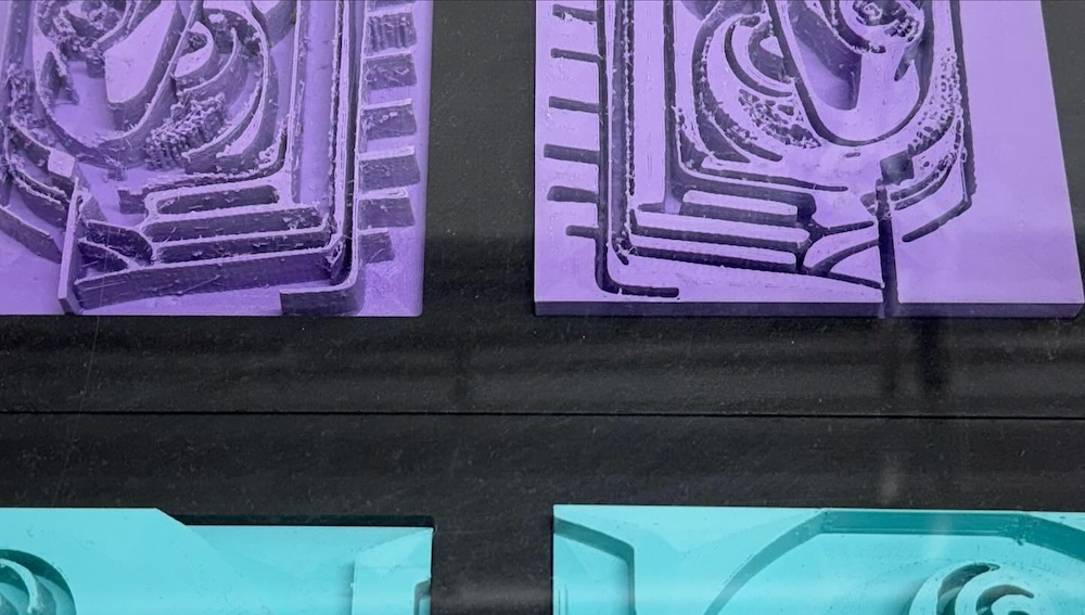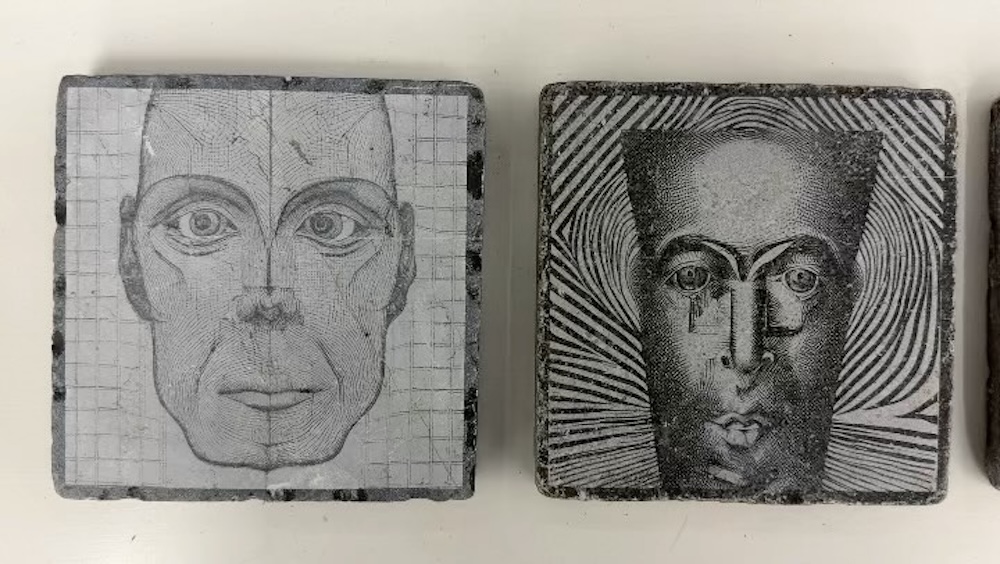 A hundred years later, DDV gets to work with AI-generated images (over three hundred at the "danny devos" prompt), microcontrollers, new printing techniques on fabric, 3D printed sculptures and engravings on blue stones, to staggeringly show how our world has changed.