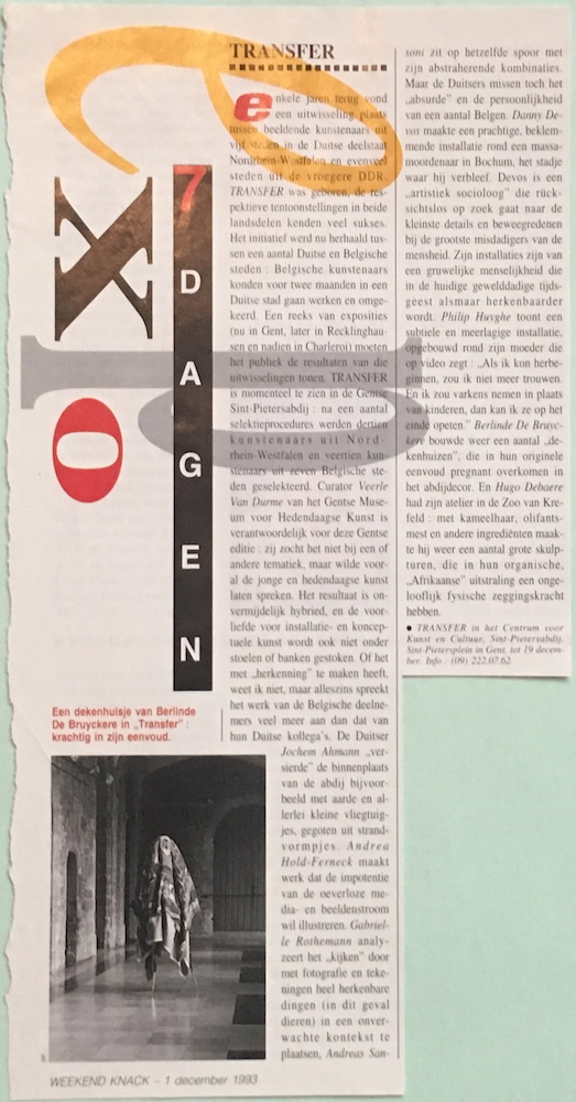 Enkele jaren terug vond een uitwisseling plaats tussen beeldende kunstenaars uit vijf steden in de Duitse deelstaat Nordrhein Westfalen en evenveel steden uit de vroegere DDR. TRANSFER was geboren, de respektieve tentoonstellingen in beide landsdelen kenden veel sukses. Het initiatief werd nu herhaald tussen een aantal Duitse en Belgische steden : Belgische kunstenaars konden voor twee maanden in een Duitse stad gaan werken en omgekeerd. Een reeks van exposities (nu in Gent, later in Recklinghausen en nadien in Charleroi) moeten. het publiek de resultaten van die uitwisselingen tonen. TRANSFER is momenteel te zien in de Gentse Sint-Pietersabdij : na een aantal selektieprocedures werden dertien kunstenaars uil Nord thein-Westfalen en veertien kunstenaars uit zeven Belgische steden geselekteerd. Curator Veerle Van Durme van het Gentse Museum voor Hedendaagse Kunst is verantwoordelik voor deze Gentse editie : zij zocht het niet bij een of andere tematiek, maar wilde vooral de jonge en hedendaagse kunst laten spreken. Het resultaat is onvermydelijk hybried, en de voor liefde voor installatie- en konceptuele kunst wordt ook niet onder stoelen of banken gestoken. Of het met herkenning" te maken heeft. weet ik niet, maar alleszins spreekt het werk van de Belgische deelnemers veel meer aan dan dat van hun Duitse kollega's. De Duitser Jochem Ahmann "versierde" de binnenplaats van de abdij bijvoorbeeld met aarde en allerlei kleine vliegtuigjes, gegoten uit strandvormpjes. Andrea Hold-Ferneck maakt werk dat de impotentie van de oeverloze media- en beeldenstroom wil illustreren. Gabrielle Rothemann analyzeert het „kijken" door met fotografie en tekeningen heel herkenbare dingen (in dit geval dieren) in een onverwachte kontekst te plaatsen, Andreas Sansoni zit op hetzelfde spoor met zijn abstraherende kombinaties. Maar de Duitsers missen toch het „absurde" en de persoonlijkheid van cen aantal Belgen. Danny Devos maakte een prachtige, beklemmende installatie rond een massamoordenaar in Bochum, het stadje waar hij verbleef. Devos is een „artistiek socioloog" die rücksichtslos op zoek gaat naar de kleinste details en beweegredenen bij de grootste misdadigers van de mensheid. Zijn installaties zijn van een gruwelijke menselijkheid die in de huidige gewelddadige tijdsgeest alsmaar herkenbaarder wordt. Philip Huyghe toont een subtiele en meerlagige installatie, opgebouwd rond zijn moeder die op video zegt : „Als ik kon herbeginhen, zou ik niet meer trouwen. En ik zou varkens nemen in plaats van kinderen, dan kan ik ze op het einde opeten." Berlinde De Bruyckeré bouwde weer een aantal „dekenhuizen", die in hun originele eenvoud pregnant overkomen in het abdijdecor. En Hugo Debaere had zijn atelier in de Zoo van Krefeld : met kameelhaar, olifantsmest en andere ingredienten maakte hij weer een aantal grote skulpturen, die in hun organische, „Afrikaanse" uitstraling een ongelooflijk fysische zeggingskracht hebben.