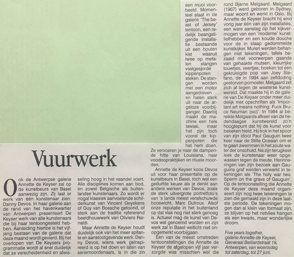 Ook de Antwerpse galerie Annette de Keyser zal op de kunstbeurs van Basel aanwezig zijn. Zij laat er werk van één kunstenaar zien: Danny Devos. In haar galerie aan de rand van het havenkwartier van Antwerpen presenteert De Keyser werk van alle kunstenaars die bij haar tentoongesteld hebben. Aanleiding hiertoe is het vijfjarig bestaan van de galerie dat deze maand wordt gevierd. Bij het overlopen van De Keysers programmatie wordt al snel duidelijk dat ze verscheidenheid en afwisseling hoog in het vaandel voert. Alle disciplines komen aan bod, en zowel Belgische als buitenlandse kunstenaars. Zo wordt er nogal klassiek aanvoelende schilderkunst van Vincent Geyskens of Guy van Bossche getoond, of sterk aan de traditie refererend beeldhouwwerk van Oliviero Rainaldi. Maar Annette de Keyser houdt duidelijk ook van het meer spitante en aanstootgevende werk. Danny Devos, wiens werk geinspireerd is op het doen en laten van seriemoordenaars, is in die zin een mooi voorbeeld. Momenteel staat in de galerie 'The beast of Jersey' tentoon, een redelijk beangstigende installatie bestaande uit een houten kist waaruit twee op metalen stangen vastgesjorde kippenpoten steken. De stangen worden met een motor aangedreven en halen sterk uit naar de argeloze voorbijganger. Daarbij maakt de machine een hels lawaai, maar het zijn toch vooral de kippenpoten die het hem doen. Ze vervoeren je naar de dampende hitte van Louisiana, naar voodoopraktijken en rituele moorden. Annette de Keyser koos Devos uit voor haar presentatie op de kunstbeurs in Basel, toch wel een gedurfde keuze als je denkt aan andere werken van Devos, zoals de sterk uitvergrote portretfoto's van 's lands meest verafschuwde booswicht, Marc Dutroux. Alsof onze reputatie in het buitenland op dat vlak nog niet sterk genoeg is. Actueel mag de kunst van Devos wel genoemd worden en zijn werk zal in Basel wellicht niet onopgemerkt voorbijgaan.