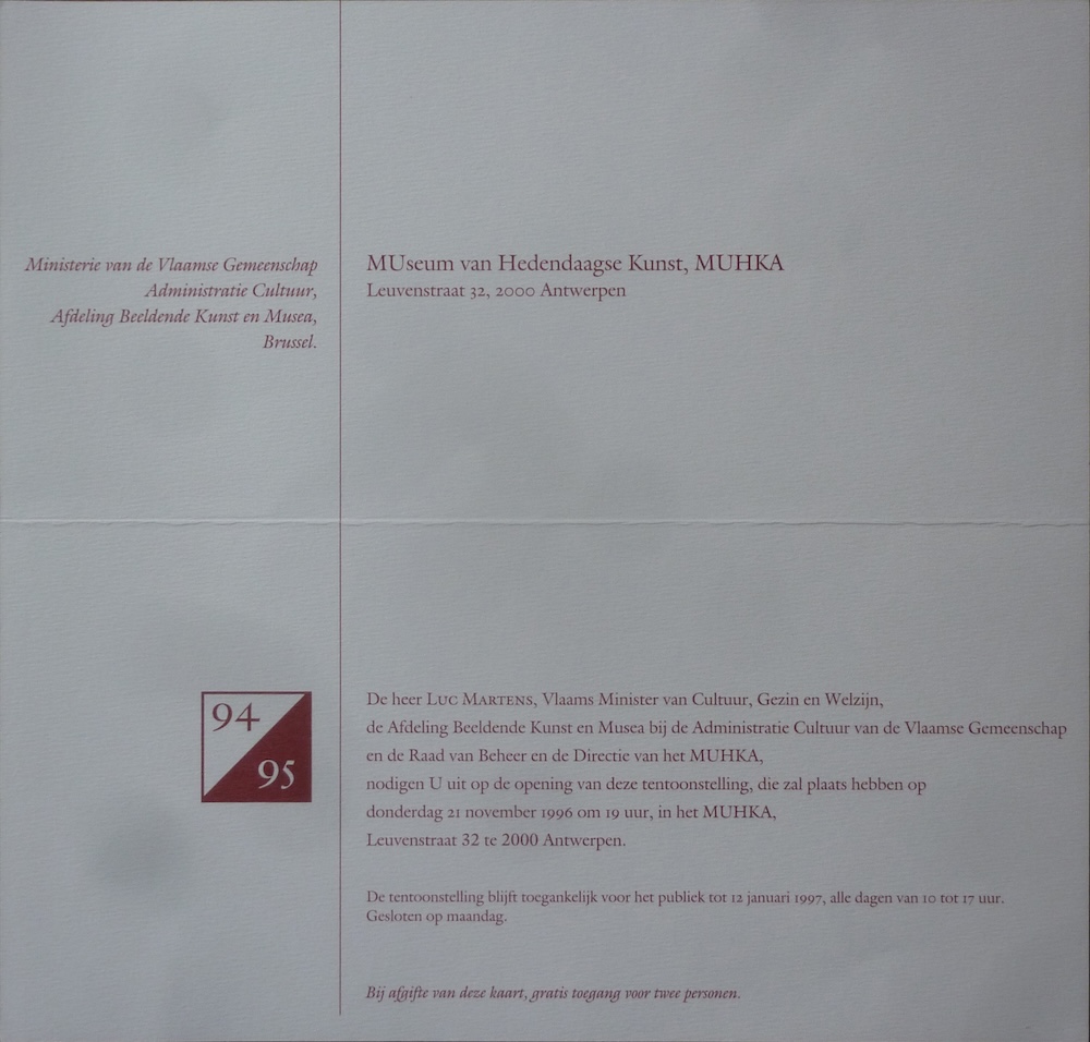 Friday 22nd of November 1996 -> Sunday 12th of January 1997 in M HKA, Leuvenstraat 32, Antwerpen, Belgium. | ||