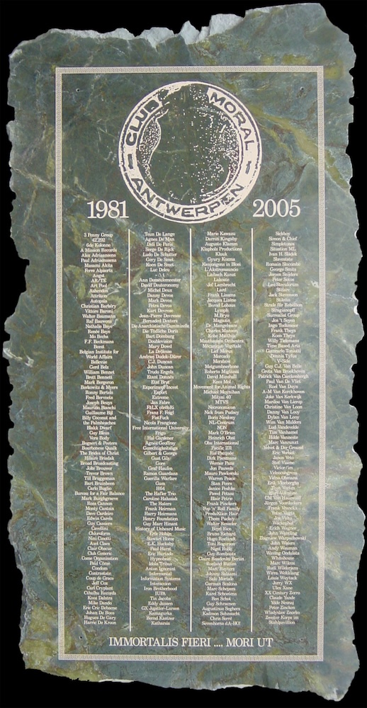 The Club Moral 'monument' was originally conceived for the exhibition Monopolis/Antwerpen (Witte de With, center for contemporary art, Rotterdam, 2005). After five years of wandering about it has now found permanent residence at the Royal Academy of Fine Arts in Antwerpen. On a monumental memorial marble slab the names of all artists, musicians, poets, writers, authors, bands and individuals who collaborated with Club Moral between 1981 and 2005 in one way or another, are listed.