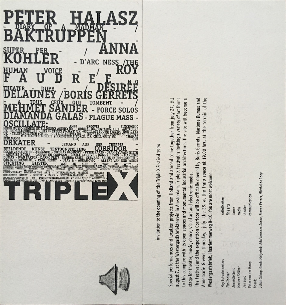Wednesday 27th of July 1994 -> Wednesday 17th of August 1994 in Westergasfabriek, Polonceaukade 27, Amsterdam, Netherlands. | ||