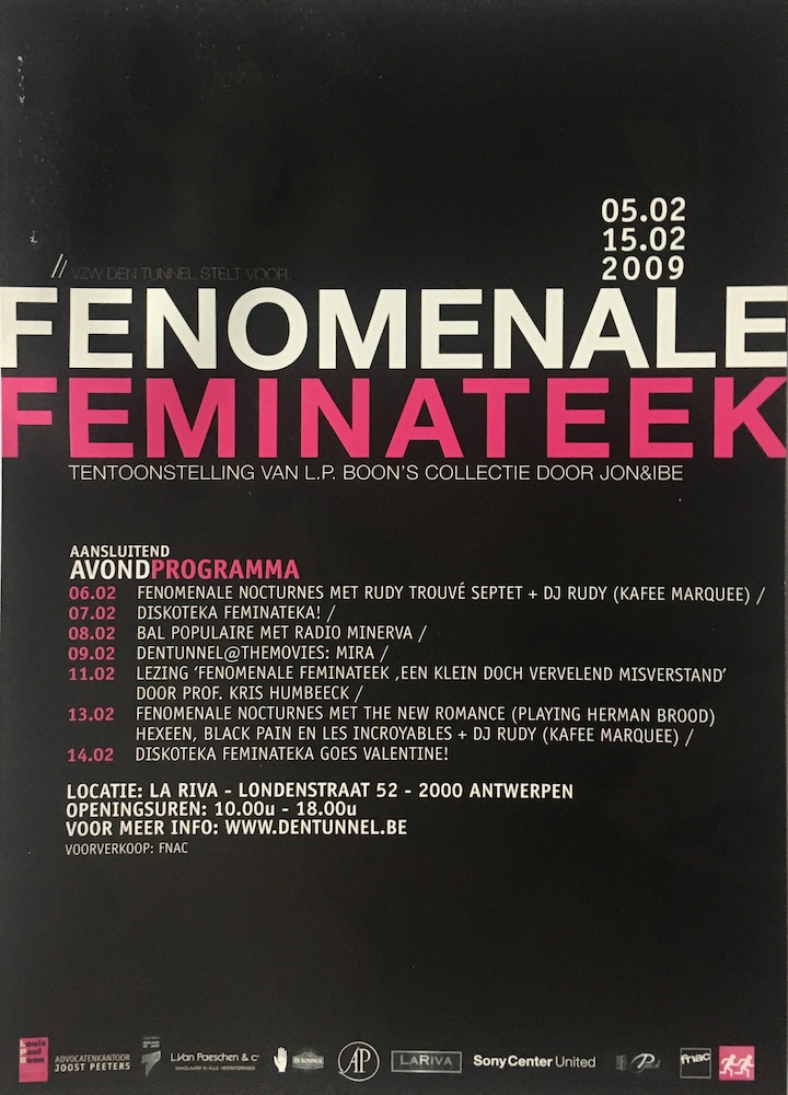 This exhibition showed our vision on the Flemish author Louis Paul Boon's collection "Phenomenal Library of Women", it is a collection of 22400 images of female eroticism compiled in 144 volumes. Despite the fact these images are all from a few decades ago they still cause controversy. In this show we brought together the images of well known painters, whom are already long respected, with images of fellow contemporary artists whom we invited to contribute an image they could link to this collection - be it because of the nudity, or the concept of cataloging. L.P. Boon wordt nog vaak bestempeld als een “viezen tiest”. Dit terwijl de kunstgeschiedenis doorspekt is met het tonen van bloot. Er werd ons gevraagd om een selectie uit zijn verzameling te maken en die van een multimediale vormgeving te voorzien. Doel van deze tentoonstelling is de collectie aan het publiek te tonen vanuit onze kunstenaarsblik. Met een knipoog naar het categoriseren, belichten we de Fenomenale Feminateek volgens drie facetten: VOELEN - het op zoek gaan naar beelden, WILLEN - het categoriseren van de beelden en KENNEN: het archiveren van de beelden. VOELEN – Tunnel der Lusten- multimediale installatie Met deze installatie maken we van de toeschouwer een voyeur. We bepalen de kijkrichting en spelen met diens verlangen om de koninginnen van Boon gade te slaan. WILLEN - Netwerk der Lusten - mixed media Het netwerk in 3 variaties: een in situ installatie met tafels, een collage op canvas en een film. We kropen in de rol van fenomenoloog en verbonden talrijke kunstwerken met Boon’ s collectie. Het categoriserende en onverzadigbare aspect van de fenomenoloog benadrukt dat hij de essentie van zijn onderwerp tot op het bot wil uitpluizen. Naast oude meesters, nodigden we hedendaagse kunstenaars uit om hun beeldend werk te linken aan de feminateek. KENNEN – Kabinet der Lusten- prentenkabinet De wetenschappelijke benadering van de collectie is deze van de beeldvorming van de vrouw. We nemen haar onder de loep door een selectie uit de categorieën met originele prenten uit de feminateek tentoon te stellen. Met dank aan de deelnemende kunstenaars: Luk Berghe, Thomas Bogaert, Wina Bogaert, Marie Julia Bollansée, Sara Bomans, Karin Borghouts, Hedwig Brouckaert, Jean-Marie Bytebier, Paul Casaer, Johan Clarysse, Colette Cleeren, Christine Clinckx, Johan Collart, Joachim Coucke, Filip Daniels, Cris De Blok, Wim Delvoye, Harry De Neve, Francis Denys, Hans Demeulenaere, Yvan Derweduwe, Gery De Smet, Danny Devos, Eddy Devos, Robert Devriendt, Luc Dondeyne, Jerry Galle, Joris Ghekiere, Karin Hanssen, Jon en Ibe, Johan Jacobz, Roeland Kotsch, Beatrijs Lauwaert, Stéphanie Leblon, Christophe Malfliet, Chris Meulemans, Kumi Oguro, David Ooms, Ria Pacquée, Piet Pollet, Pierre Pourveur, Thierry Renard, Arne Reynaert, Ingrid Schildermans, Guy Slabbinck, Annelies Slabbynck, Stichting Logos, Johan Tahon, Mieke Teirlinck, Thé Van Bergen, Dirk Van der Elst, Hans Vandekerckhove, Eric Vande Pitte, Luc Vandervelde lux!, Ànne-Mie Van Kerckhoven, Yves Velter, Patrik Vermeulen, Geert Verschueren, HeidiVoet, Leen Voet, Wim Wauman | ||