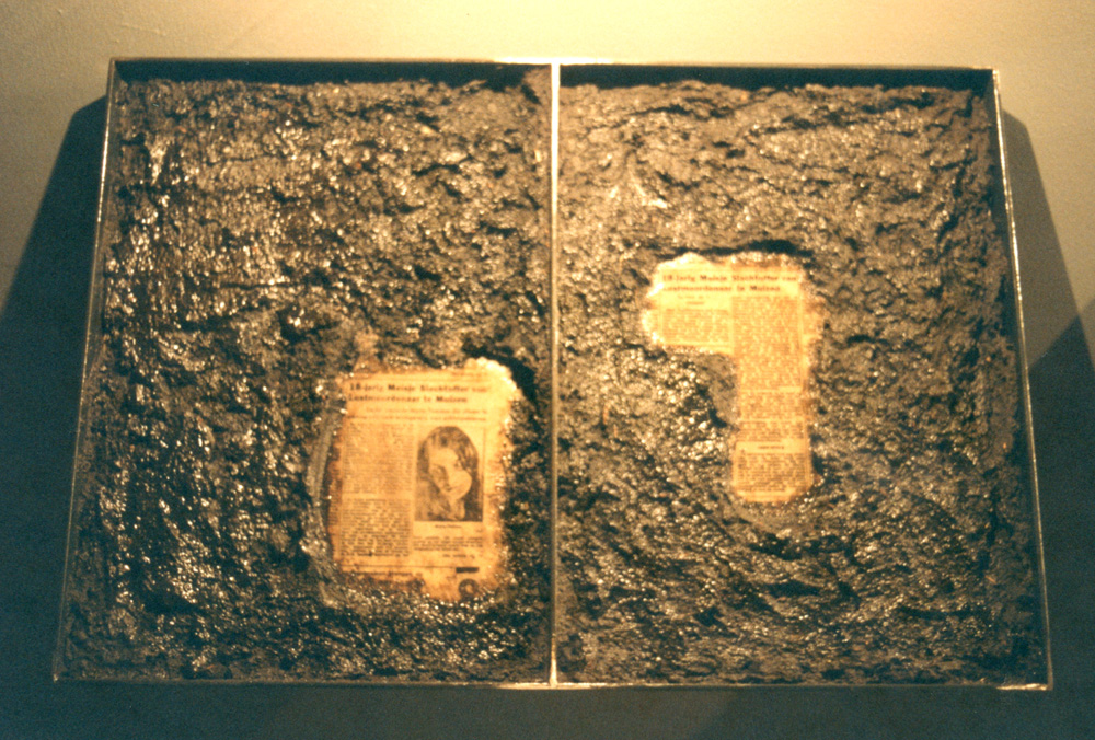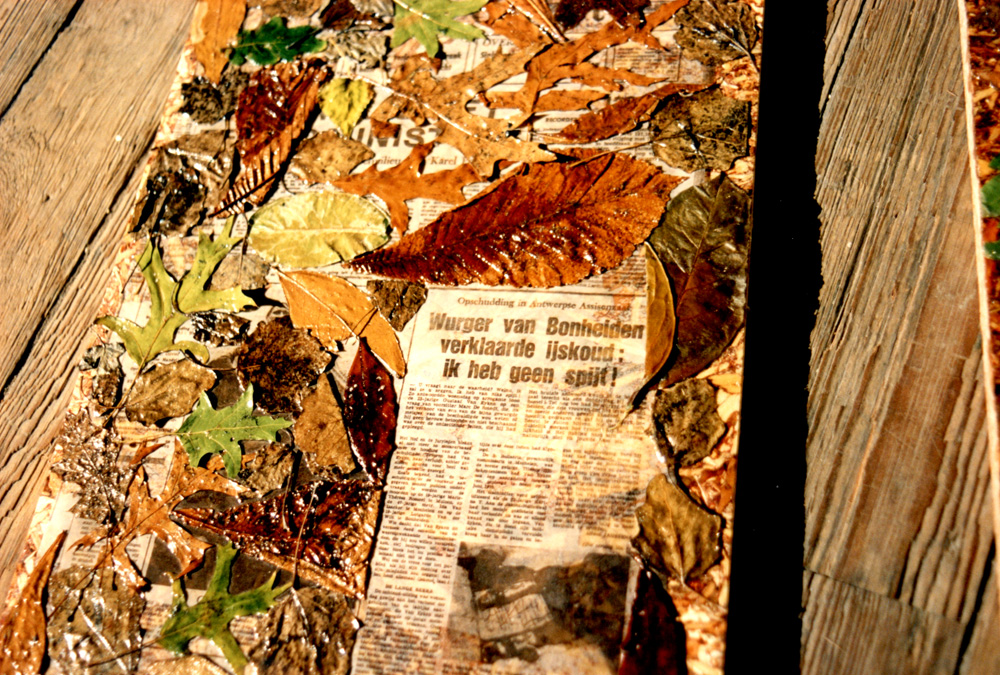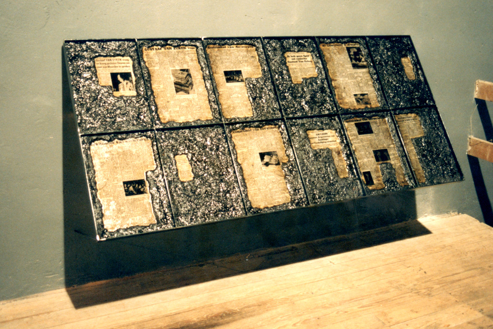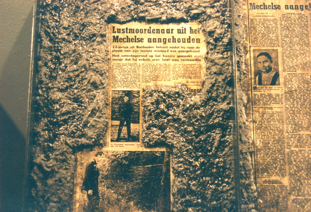 Newspaper articles about Staf Van Eyken aka 'De Vampier van Muizen' covered with dirt and leaves from the crime scenes. | ||