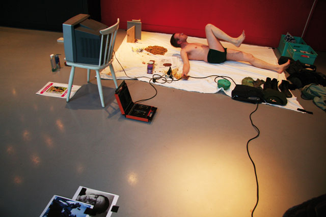 Ik legde een laken op de grond en gooide pamfletten naar de toeschouwers. Op een kleine tv-monitor speelde een stukje uit een documentaire over Holger Meins.