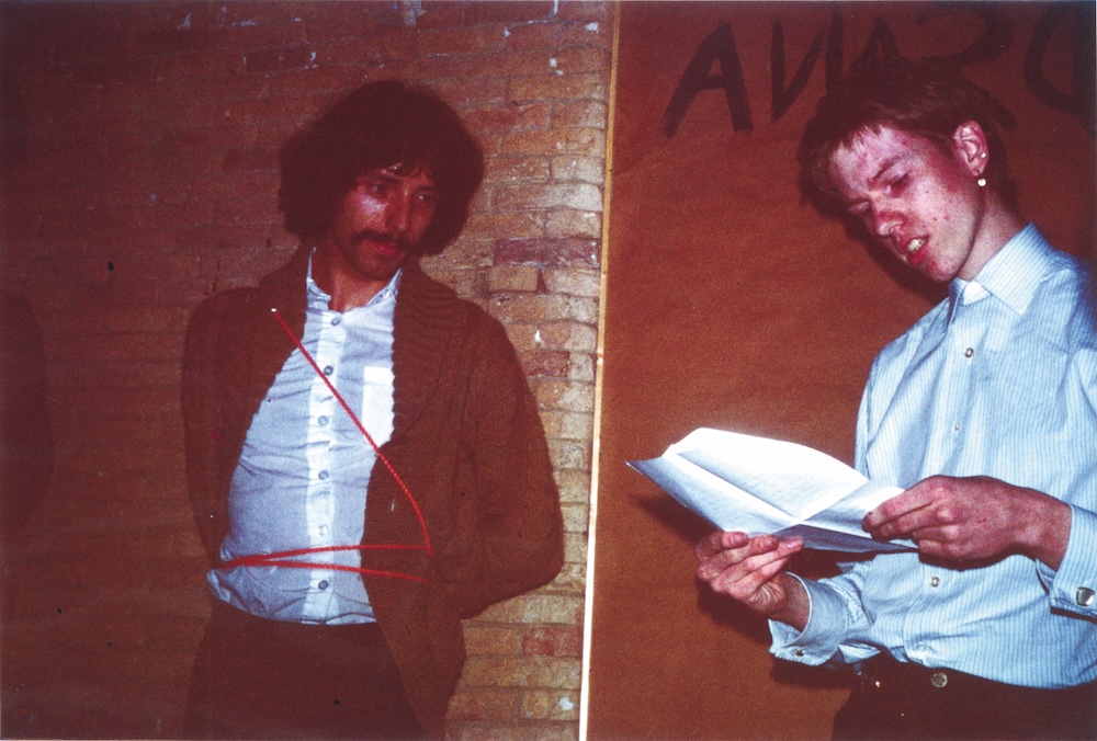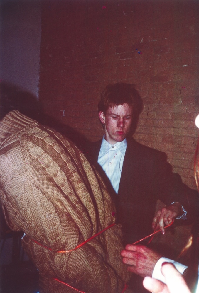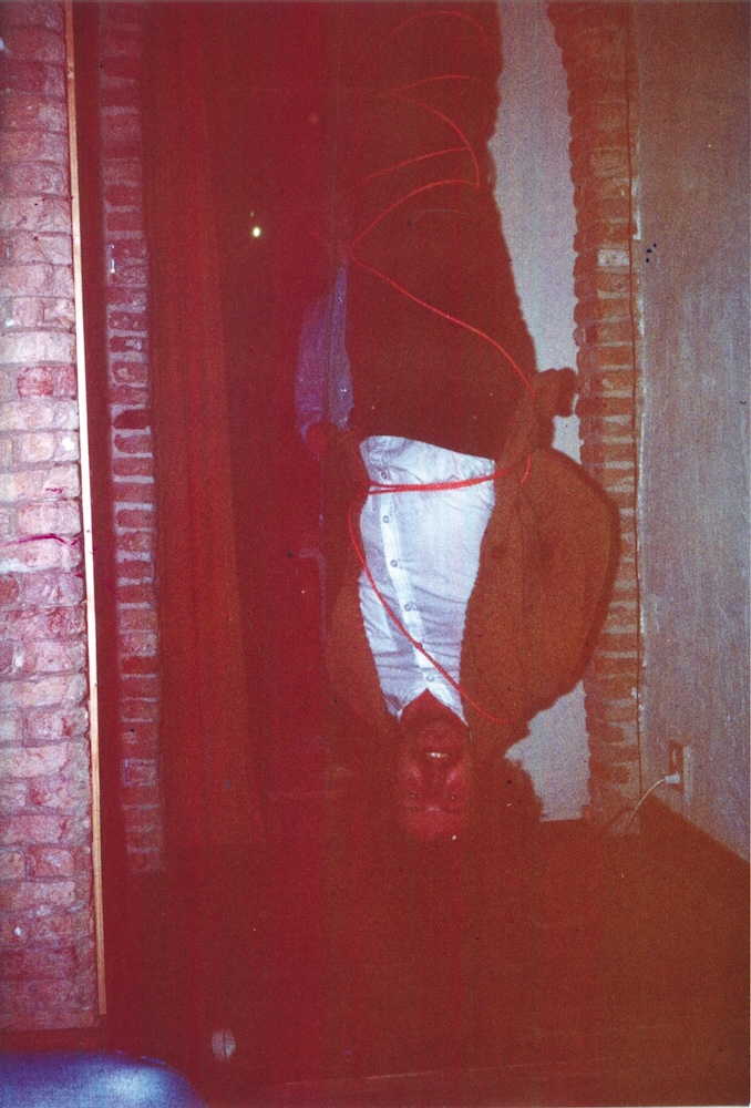 Omdat ik problemen had met de eigenaar van de galerij in verband met mijn performance heb ik hem vastgebonden een verklarende tekst voorgelezen en hem met zijn voeten aan het plafond gehangen. Because I had problems with the owner of the gallery concerning my performance I tied him up read an explaining text and hung him with his feet from the ceiling. | ||