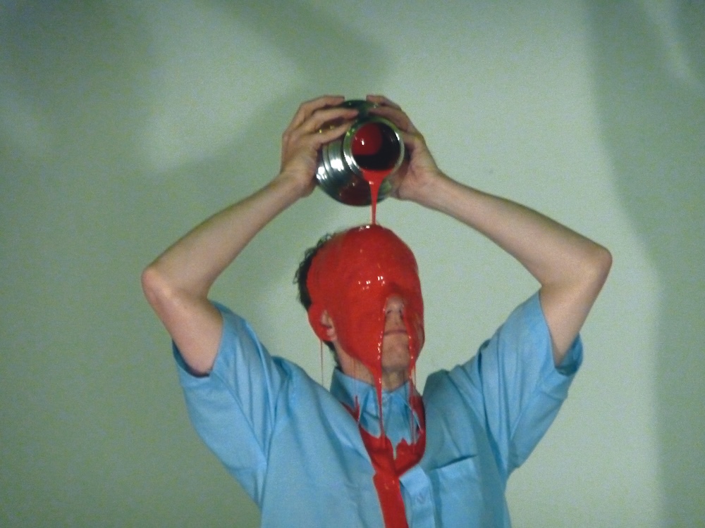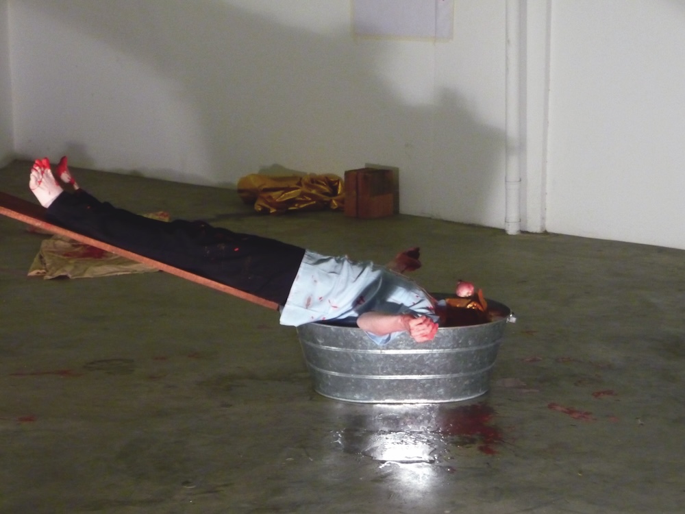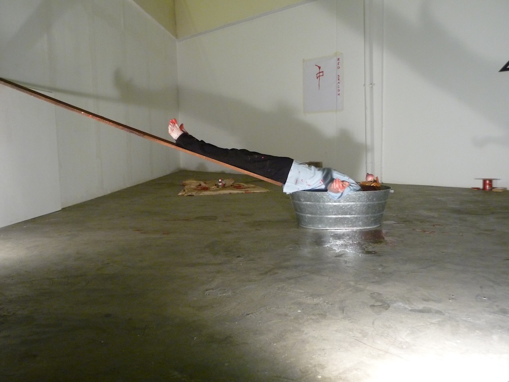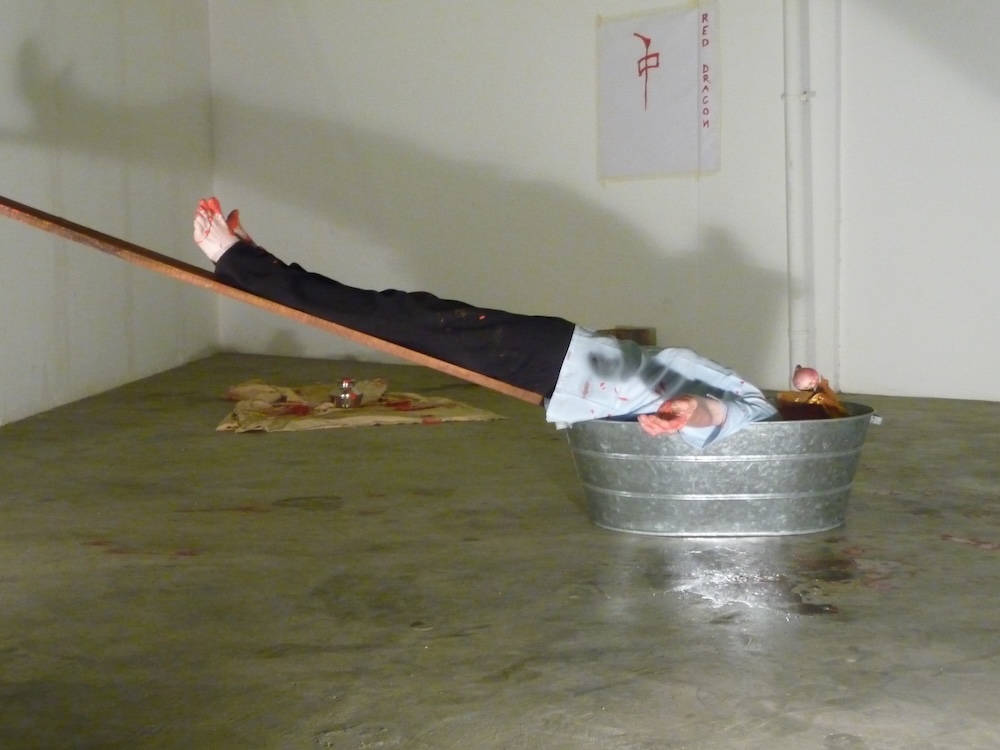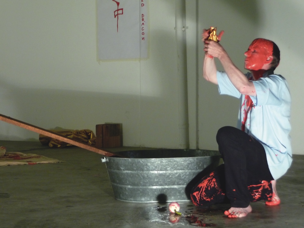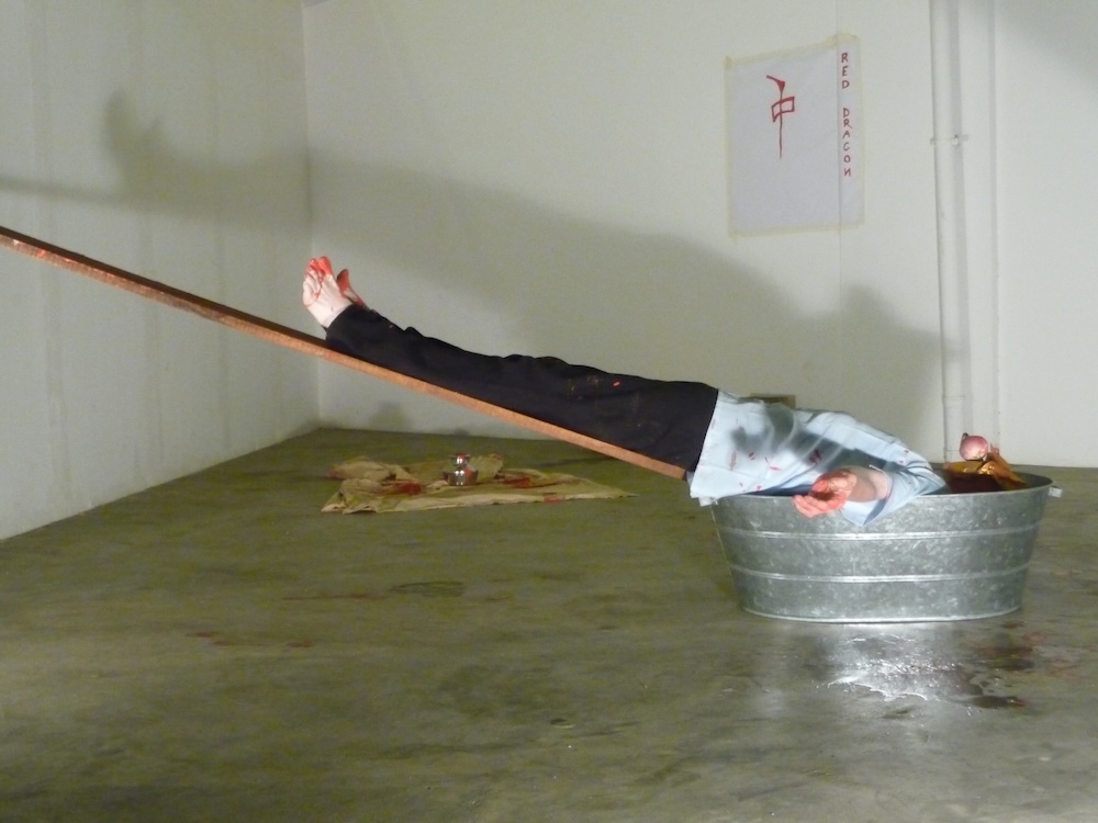 Ik tekende met rode verf het teken van de 'Red Dragon' op een blad papier. Dan stond ik een tijd op een doek met een rituele melk 'kavadi' op mijn hoofd. In de kavadi zat rode verf die ik langzaam over mijn hoofd uitgoot. Daarna maakte ik een prop van een stuk gouden stof gevuld met aarde uit mijn put. Ik ging op een schuine plank liggen met mijn hoofd ondergedompeld in een teil met water. De prop stopte ik in mijn mond en in de prop een ongeopende lotusbloem. Ik bleef met mijn hoofd onder water liggen tot de prop en de lotusbloem helemaal doorweekt waren en ik niet meer kon ademen. I drew the sign of the 'Red Dragon' on a sheet of paper with red paint. Then I stood for a while on a piece of cloth with a ritual milk 'kavadi' on my head. The kavadi was filled with red paint that I slowly poured over my head. Then I made a wad out of a piece of gold cloth filled with earth from my hole. I lay down on a sloping piece of wood my head immersed in a tub of water. I stuffed the wad in my mouth and an unopened lotus flower into the wad. I remained with my head in the water until the wad and the lotus flower were completely sodden and I couldn't breathe no more. | ||