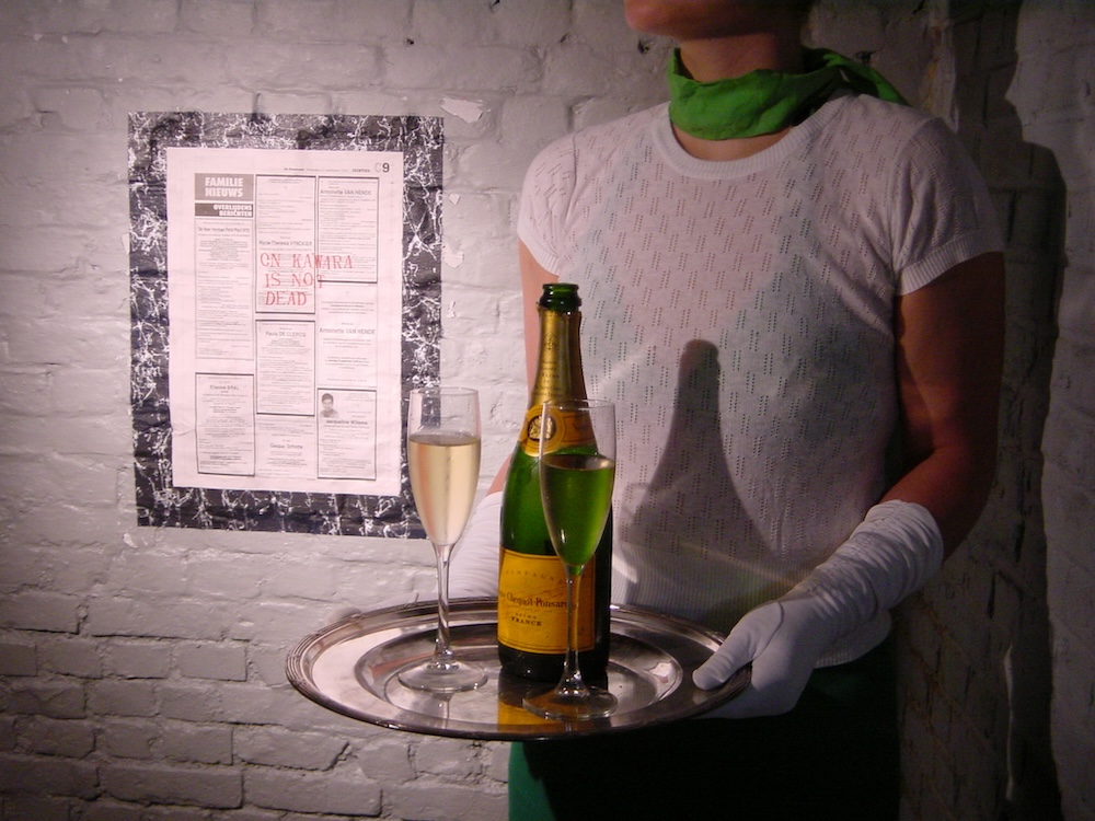 Op mijn verjaardag organiseerde ik een geanimeerde ‘officiële opening’ van de ‘Bastard Art Gallery’ waar een aantal van mijn projecten op ‘geheime locaties’ ondergebracht waren. Ik kocht een full-page advertentie in een kunsttijdschrift om het evenement aan te kondigen en nodigde 7 betrouwbare gasten uit. Er werden uitgelezen drankjes van zogenaamde ‘sponsors’ geschonken door sexy barmeisjes en er was een exclusieve Dj-set van de roemruchte Carl Cryplant. On the occasion of my birthday I organised an eventful ‘official opening’ of the ‘Bastard Art Gallery’ which housed some of my projects on ‘undisclosed locations’. I bought a full-page advertisement in an art magazine to announce the event and invited 7 trustworthy guests to attend. Exquisite drinks by so-called ‘sponsors’ were served by sexy waitresses and there was an exclusive Dj-set by the infamous Carl Cryplant. | ||