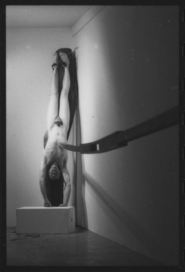 Ik hing naakt omgekeerd aan een boom die ik in de galerie had gezet. Tussen mijn lichaam en de deur zat een lange stok geklemd. I was hanging naked upside down on a tree which I had brought into the gallery. Between my body and the door a long stick was stuck. | ||