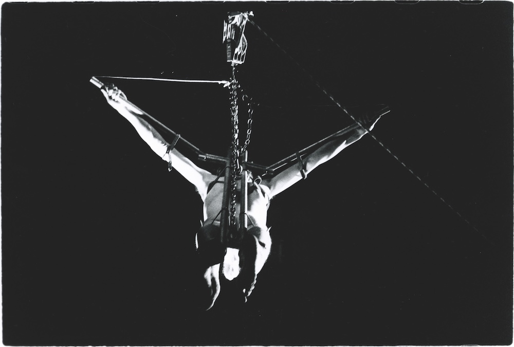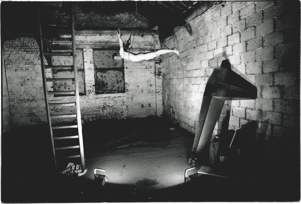 Tijdens de opening van een tentoonstelling hing ik verlicht door stroboscoop-licht in de nok van het gebouw naakt aan een zelfgemaakt metalen draagstel. During the opening of an exhibition I hung naked from a self-made metal structure in the top-ridge of the building lighted by a stroboscope. | ||