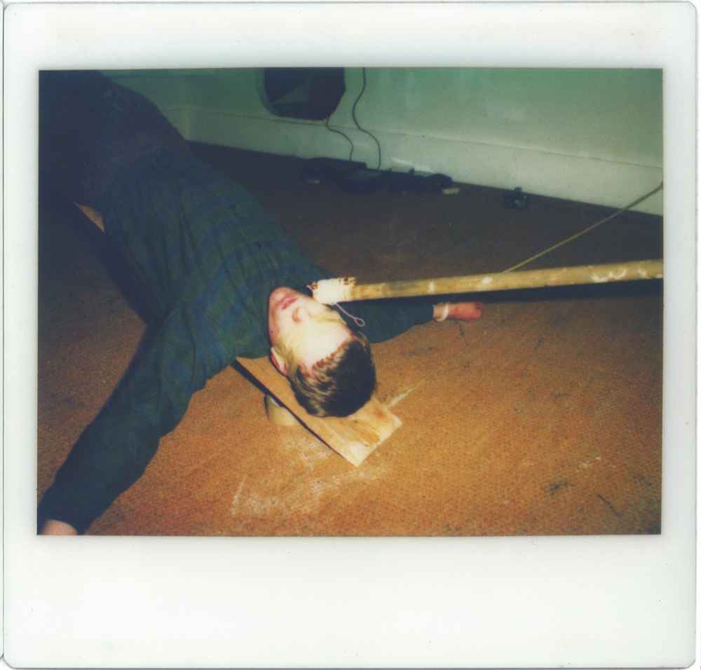 Ik lag op een plank met mijn armen gespreid. Tussen mijn keel en de deur zat een stok met een scherp mes geklemd. I was laying on a piece of wood with my arms spread. Between my throat and the door a stick with a sharp knife was jammed. | ||