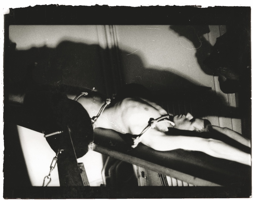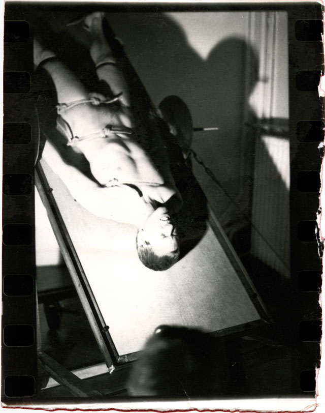 De ruimte was door een uitgezaagd decor in twee stukken verdeeld. Langs de ene kant lag ik naakt op een metalen ronddraaiende tafel vastgebonden en verlicht door een stroboscoop. Langs de andere kant kon het publiek de performance enkel door een paar kleine gaten in het decor zien. Door het stroboscoop-effect leek het alsof ik soms wèl en soms niet op de tafel lag. The space was divided in two parts by a cutout décor. On one side I was laying naked on a rotating metal table lighted by a stroboscope. From the other side the public could see the performance only through a few small holes in the décor. The stroboscope made it look like sometimes I was on the table and sometimes I wasn’t. | ||